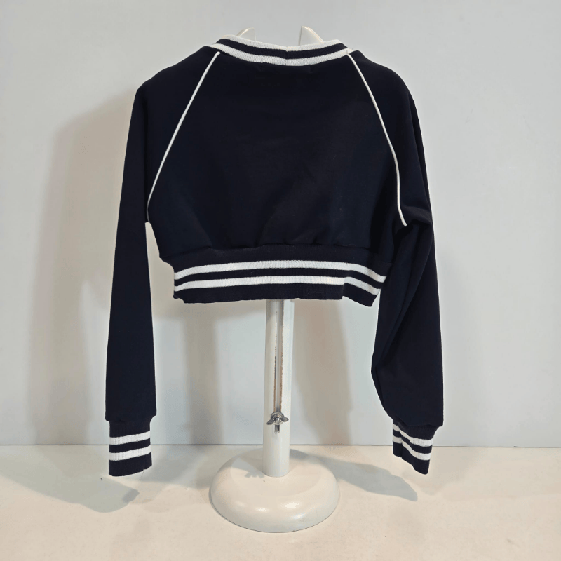 Jersey tipo sudadera corta très chic transfer primavera verano. Sudadera corta navy de Noma Fernández con transfer dorado très chic, rib blanco en puños y cintura y bajo con tul vaporoso. Suave, ligera y perfecta para looks frescos de primavera–verano.