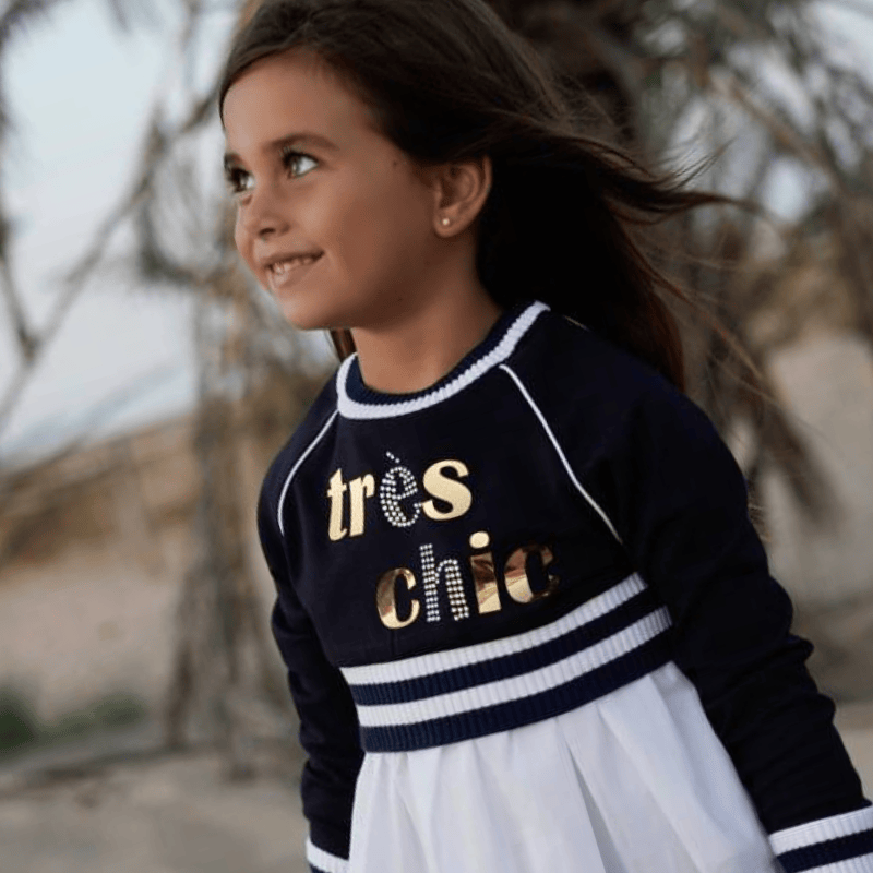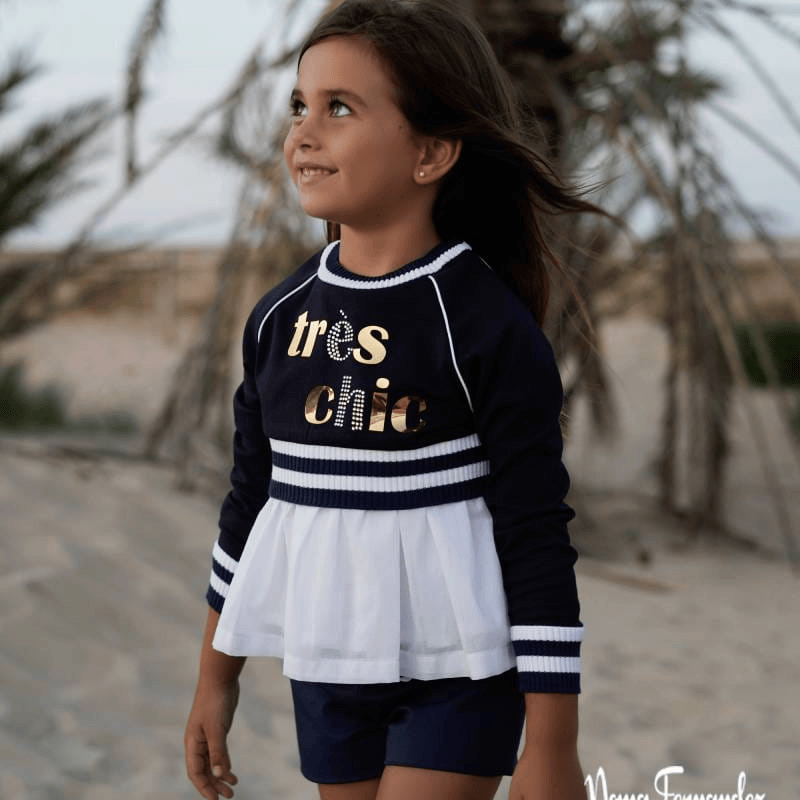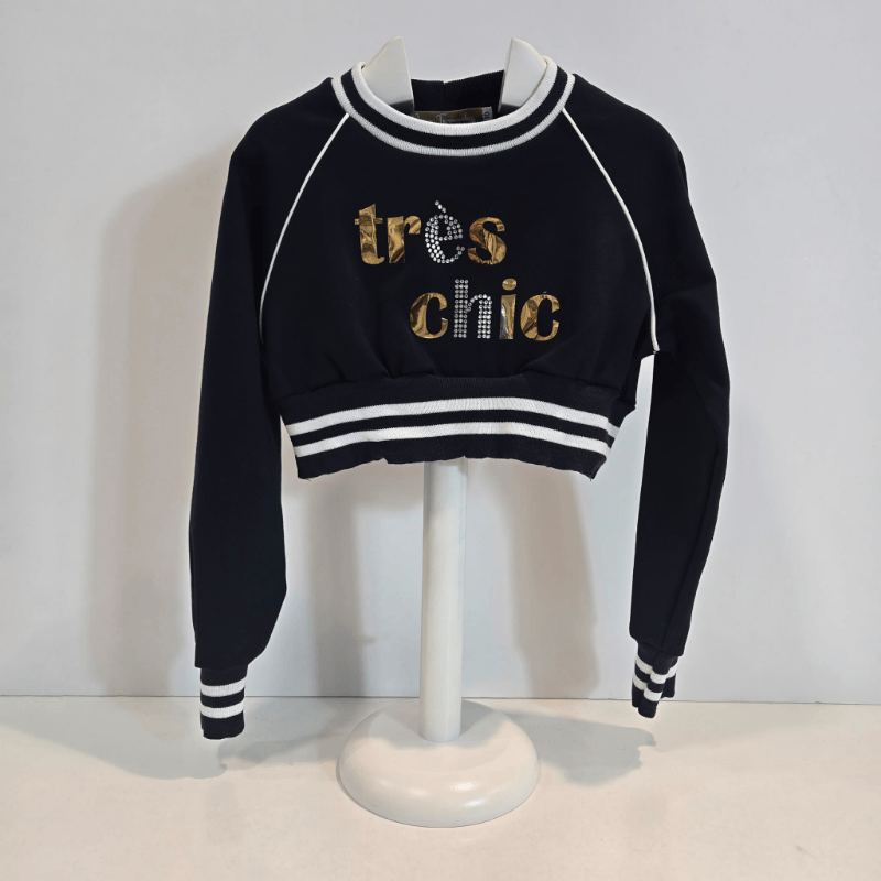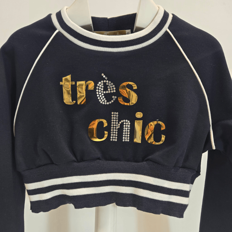 Sudadera corta tipo jersey de la firma Noma Fernández, diseñada para aportar estilo y frescura en los días luminosos de primavera y verano. Confeccionada en un suave punto de algodón en color marino, destaca por su corte moderno y cómodo, perfecto para combinar con faldas, shorts o conjuntos más arreglados. El delantero luce un transfer dorado con brillo que forma la frase très chic, aportando un toque sofisticado y juvenil que enamora a primera vista.