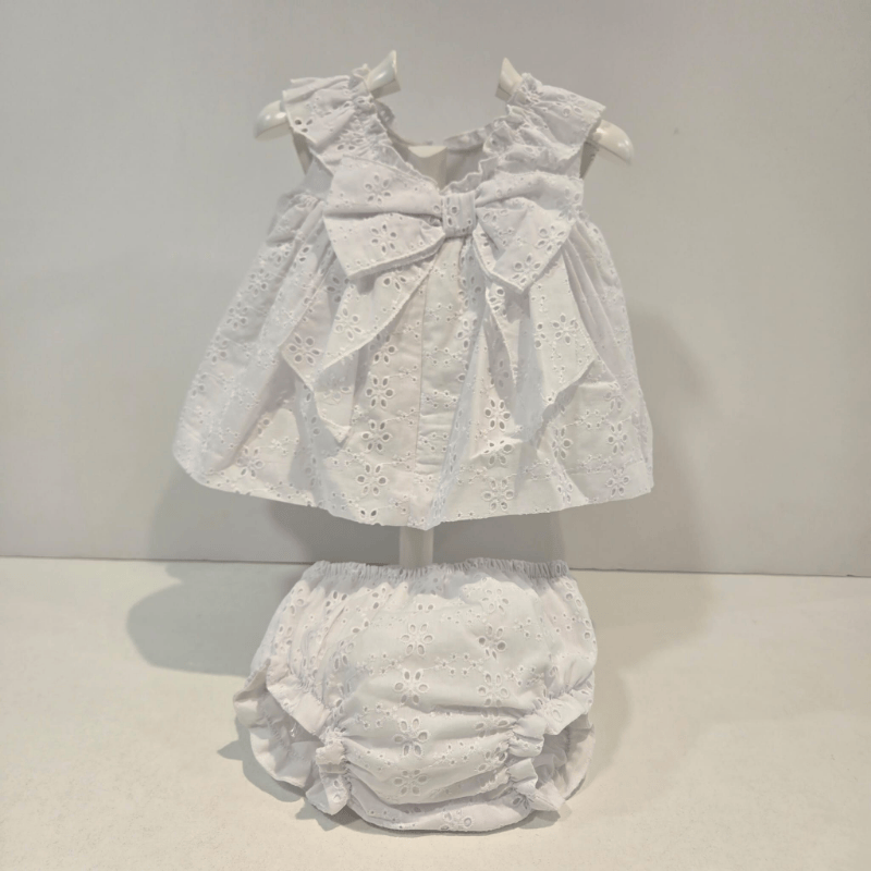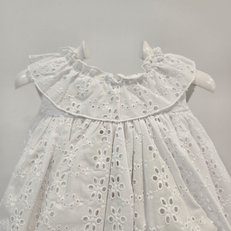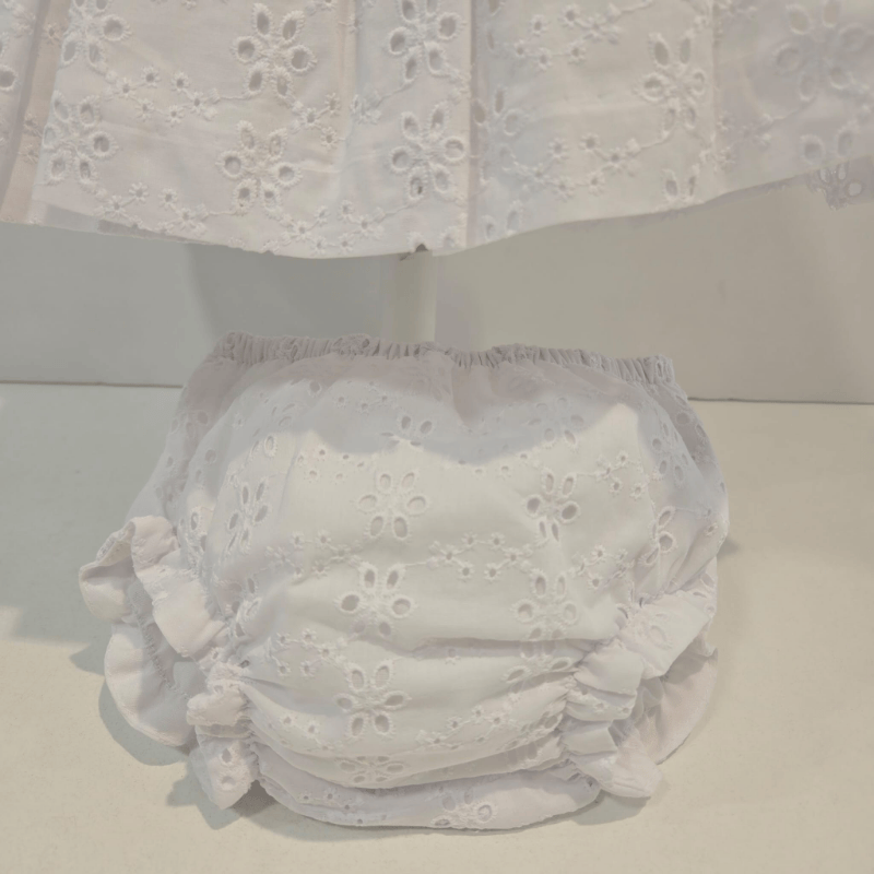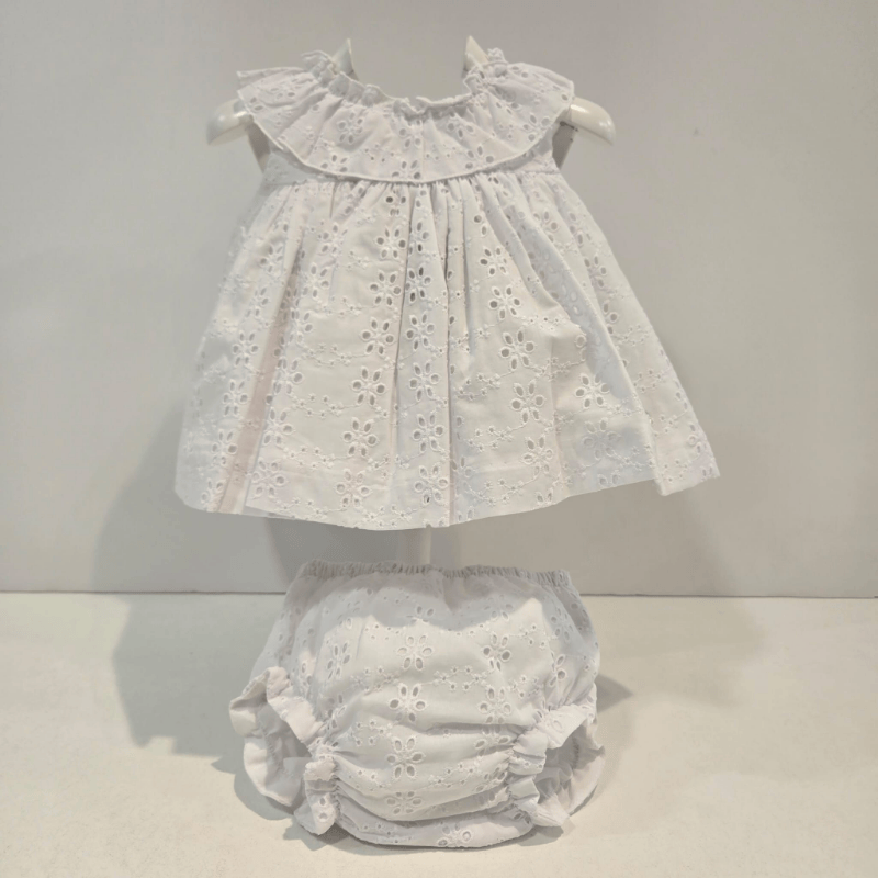 Jesusito algodón blanco adornos calados primavera verano. Jesusito de algodón blanco con delicados calados florales y puntitos bordados, firmado por Martín Aranda. Incluye braguita a juego y luce un diseño fresco, elegante y perfecto para los días cálidos. Una prenda luminosa y clásica para las pequeñas de la casa.