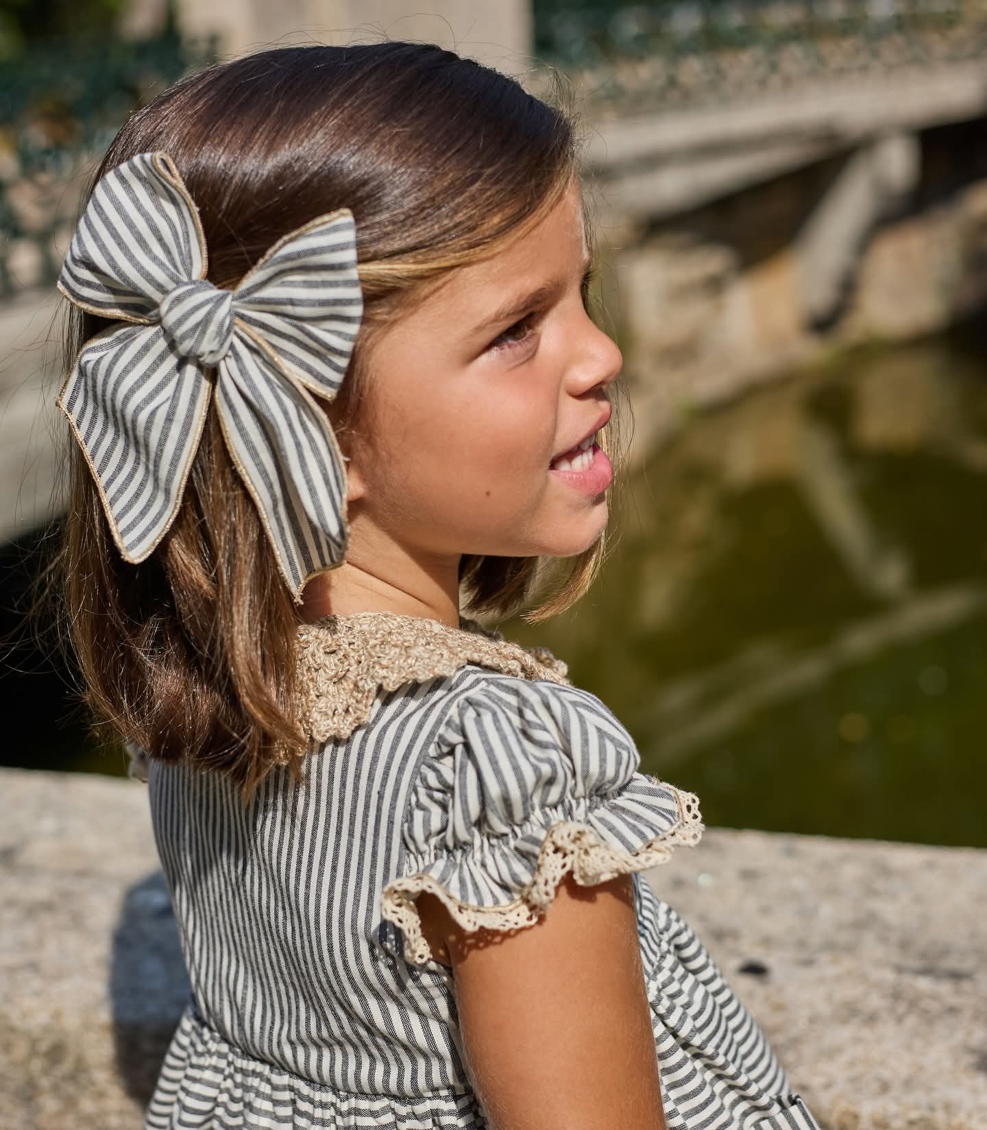 Este Jesusito de la colección Coffee de La Martinica es una pequeña joya para los días luminosos de primavera y verano. Confeccionado en un tejido listado gris y blanco de tacto suave, destaca por su cuello de ganchillo artesanal, un detalle que aporta ese aire tradicional tan característico de la firma. El diseño incluye manguitas rematadas con puntilla, botones decorativos en el delantero y un pequeño bolsillo adornado con encaje, creando un conjunto equilibrado entre lo clásico y lo actual. Su caída ligera y su estilo atemporal lo convierten en una prenda ideal para paseos, celebraciones o cualquier día especial bajo el sol. Un Jesusito pensado para niñas que brillan con naturalidad, con ese encanto dulce que solo La Martinica sabe capturar.