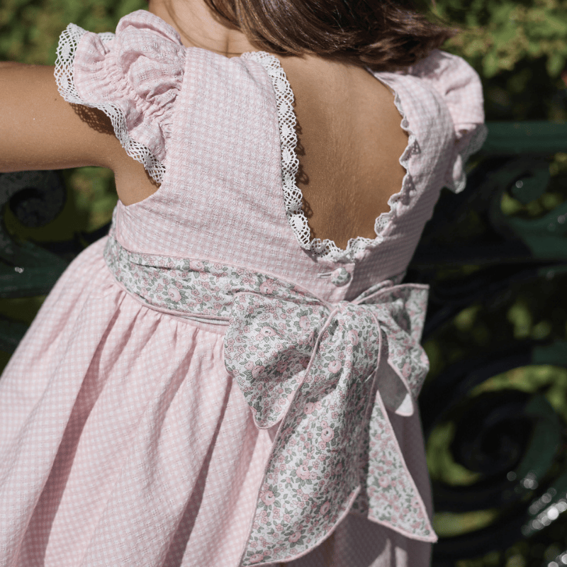 Jesusito cuadros vichy braga estampada liberti a juego verano. Jesusito de La Martinica con cuerpo en cuadro vichy y braguita en estampado liberty, rematado con cinta floral a juego en la cintura. Fresco, dulce y perfecto para primavera–verano. Chaqueta no incluida en el precio