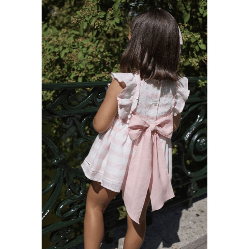 Jesusito cup cake mas braga en tela colección primavera verano. Jesusito de la firma La Martinica de la colección Cup Cake, confeccionado en tela ligera de rayitas rosa y blanco. Volantes en los hombros, espalda abotonada y lazo grande. Incluye braguita a juego. Fresco, dulce y perfecto para primavera–verano.