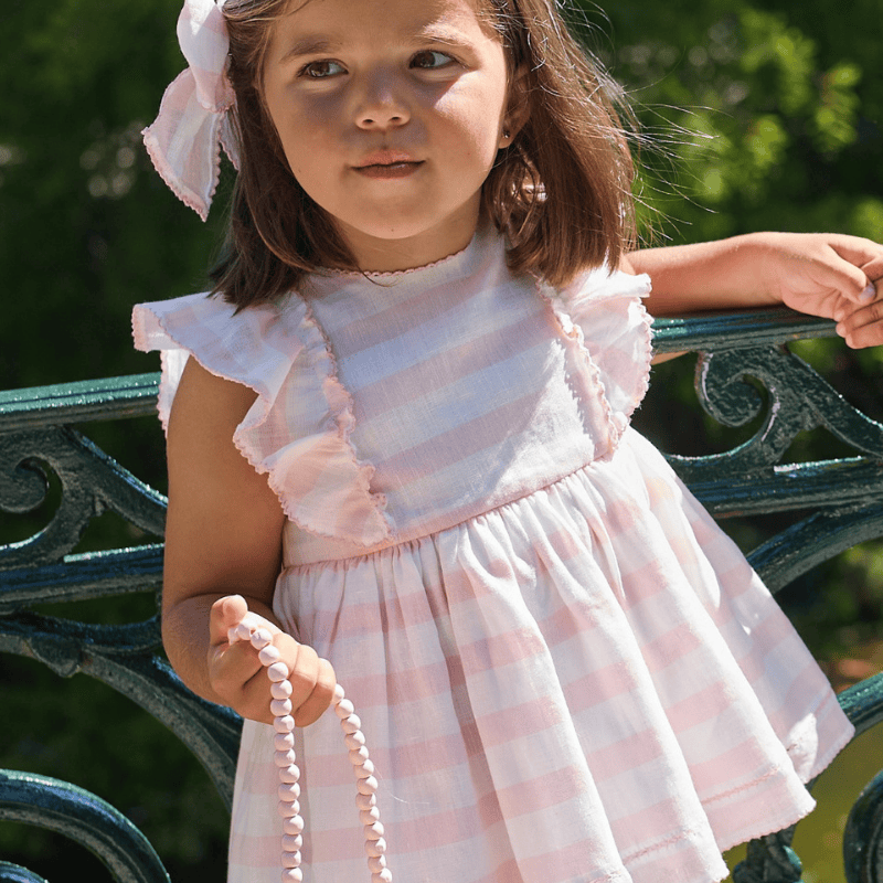Este Jesusito de La Martinica colección Cup Cake está pensado para las pequeñas que iluminan el verano con su dulzura. Confeccionado en una tela ligera de rayitas rosa y blanco, combina frescura, comodidad y un encanto clásico que nunca pasa de moda. Los volantes suaves en los hombros aportan movimiento y un toque coqueto, mientras que la espalda abotonada y el lazo grande completan un diseño cuidado hasta el último detalle. Un Jesusito que sabe a verano, a tardes largas y a risas pequeñas que llenan el aire. Incluye braguita a juego, confeccionada en la misma tela, para un conjunto armonioso y perfecto para los días de paseo, celebraciones familiares o cualquier momento especial bajo el sol. Un Jesusito que huele a azúcar fina, a luz rosada sobre la piel, a infancia que se guarda como un tesoro en los veranos que nunca se olvidan.