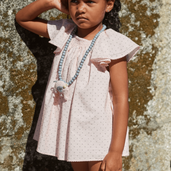 Jesusito estampado colección babalú La Martinica verano 2025. El conjunto infantil destaca por su encanto y delicadeza. El vestido tiene un patrón de pequeños corazones grises distribuidos de manera uniforme sobre un fondo rosa claro. Su diseño incluye un cuello fruncido y elástico, que aporta un toque cómodo y ajustado al estilo. Las mangas son cortas, amplias y adornadas con un remallado fruncido en los bordes, lo que añade textura y detalle. La braguita a juego, confeccionada con la misma tela estampada, cuenta con un elástico en la cintura y en las piernas, garantizando comodidad y ajuste seguro. El conjunto emana frescura y elegancia, ideal para la temporada de primavera verano 2025 de la firma La Martinica.