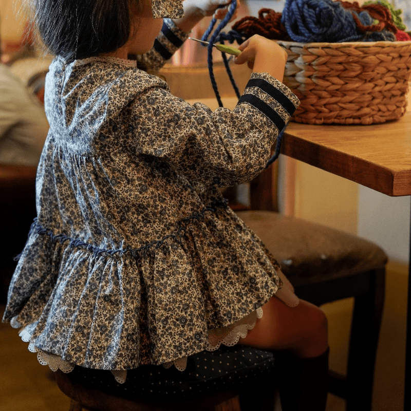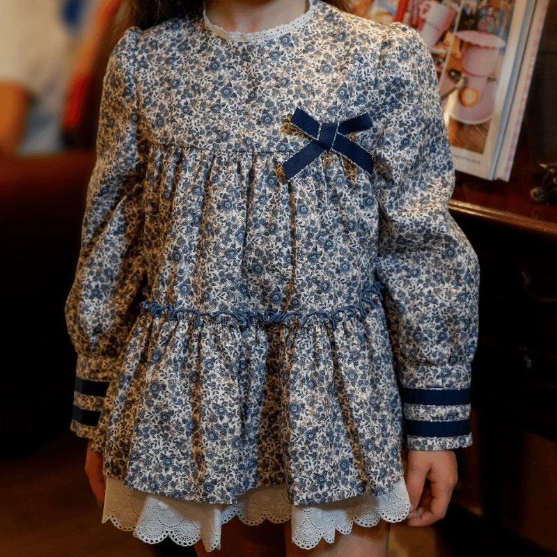 Este Jesusito de la colección Casandra de Noma Fernández para otoño-invierno 2025/26 es una joya de inspiración clásica. Confeccionado en tejido estampado floral sobre fondo azul empolvado, destaca por su corte evasé con cintura fruncida que aporta volumen y movimiento. Las mangas largas terminan en puños abullonados decorados con doble cinta azul, mientras que el pecho luce un delicado lazo a juego que añade un toque romántico. El bajo presenta un acabado festoneado con puntilla blanca, dejando entrever el forro interior que aporta estructura y elegancia. Ideal para ocasiones especiales, este diseño combina tradición y modernidad con una confección impecable. Un modelo que refleja el encanto de Boutique Luna, donde cada prenda cuenta una historia.