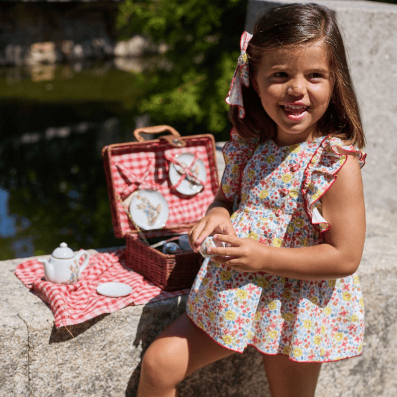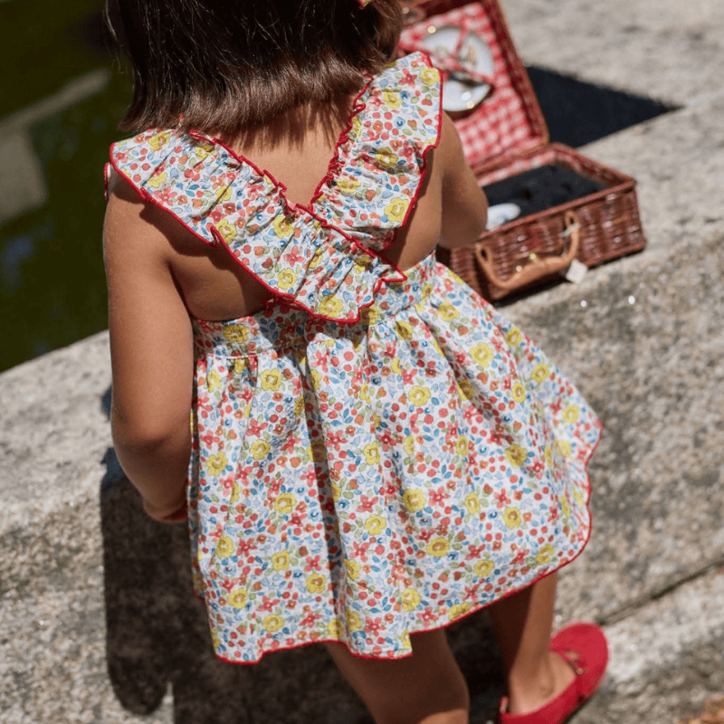 Los volantes delicados en los tirantes, rematados con un vivo rojo impecable, aportan ese aire coqueto tan característico de la firma. La espalda cruzada añade un toque especial que realza la silueta y convierte este Jesusito en una pieza única para los días de sol. El vuelo del vestido, amplio y cómodo, permite libertad total para jugar, correr y disfrutar del verano. Incluye braguita a juego para un conjunto completo y perfectamente coordinado. Una propuesta ideal para paseos, celebraciones o sesiones de fotos al aire libre.
