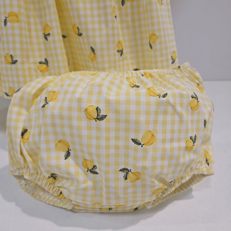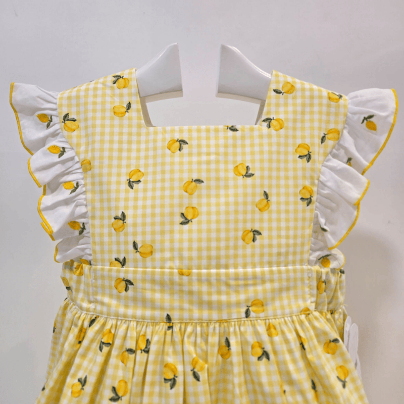 El cuerpo, limpio y fresco, luce una línea impecable que realza el estampado sin sobrecargarlo. Las mangas desmangadas con volante blanco festoneado en amarillo aportan ese contraste dulce que solo La Peppa sabe bordar: un guiño al estilo tradicional, pero con un aire moderno y luminoso. La falda, ligeramente fruncida, abre con gracia y movimiento, creando ese efecto de “pequeña brisa” que tanto favorece en los días cálidos. El conjunto se completa con su braguita a juego, confeccionada en el mismo vichy con limones, para un look totalmente coordinado y lleno de encanto.