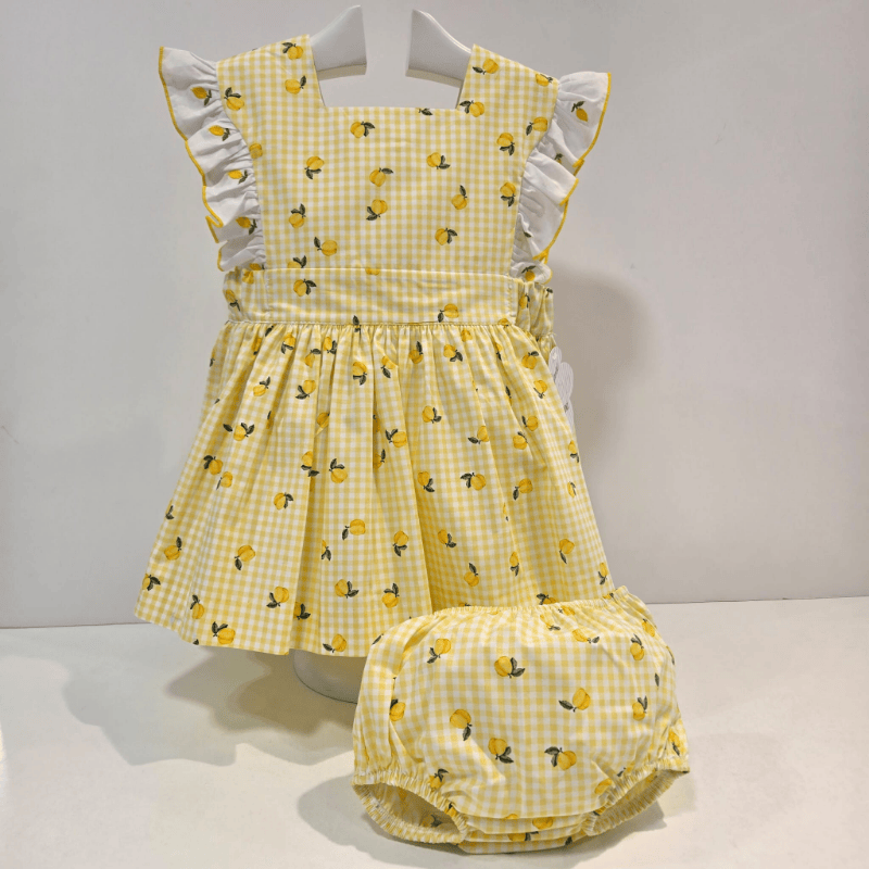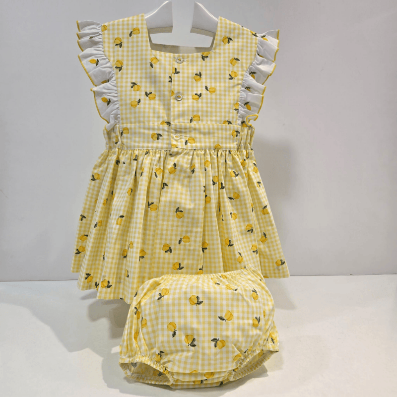 Jesusito de la colección Limón de La Peppa, confeccionado en cuadro vichy amarillo con pequeños limones estampados. Diseño desmangado con volantes blancos festoneados un conjunto fresco, alegre y perfecto para los días de verano.