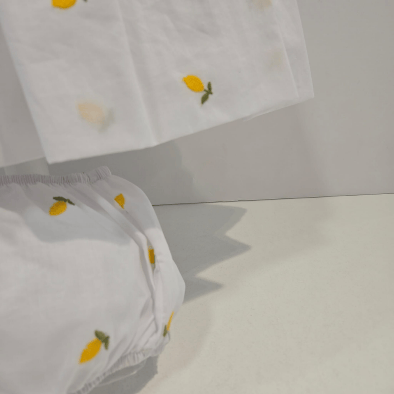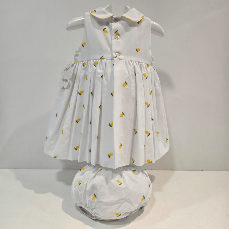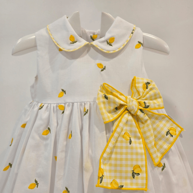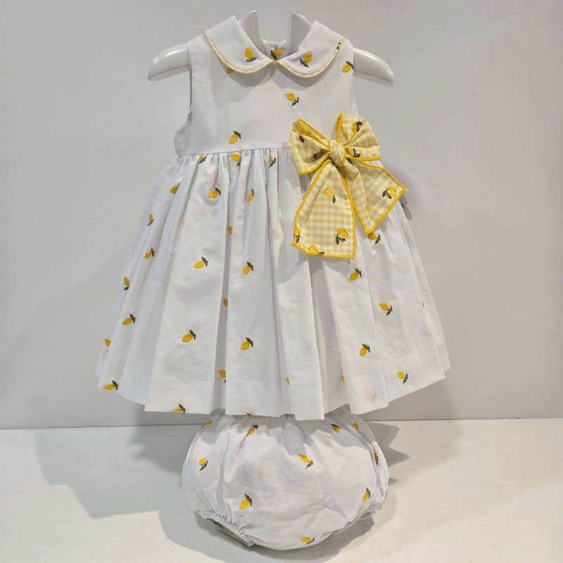 Jesusito limones La Pepa blanco estampado verano 2026. Jesusito blanco con estampado de limones y cuello bebé con vivo amarillo. Falda con vuelo y gran lazo vichy lateral, conbraguita a juego. Fresco, dulce y perfecto para el verano.