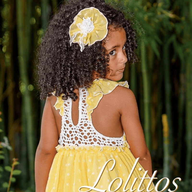Este Jesusito de la colección Pretti de Lolittos es pura luz de primavera. La parte delantera, en un amarillo vibrante y dulce, está salpicada de pequeños detalles que evocan flores diminutas y mañanas cálidas. El tejido cae con gracia, creando un movimiento suave y alegre en cada paso.
