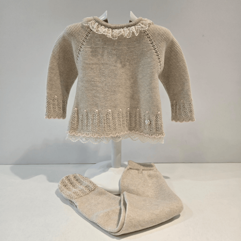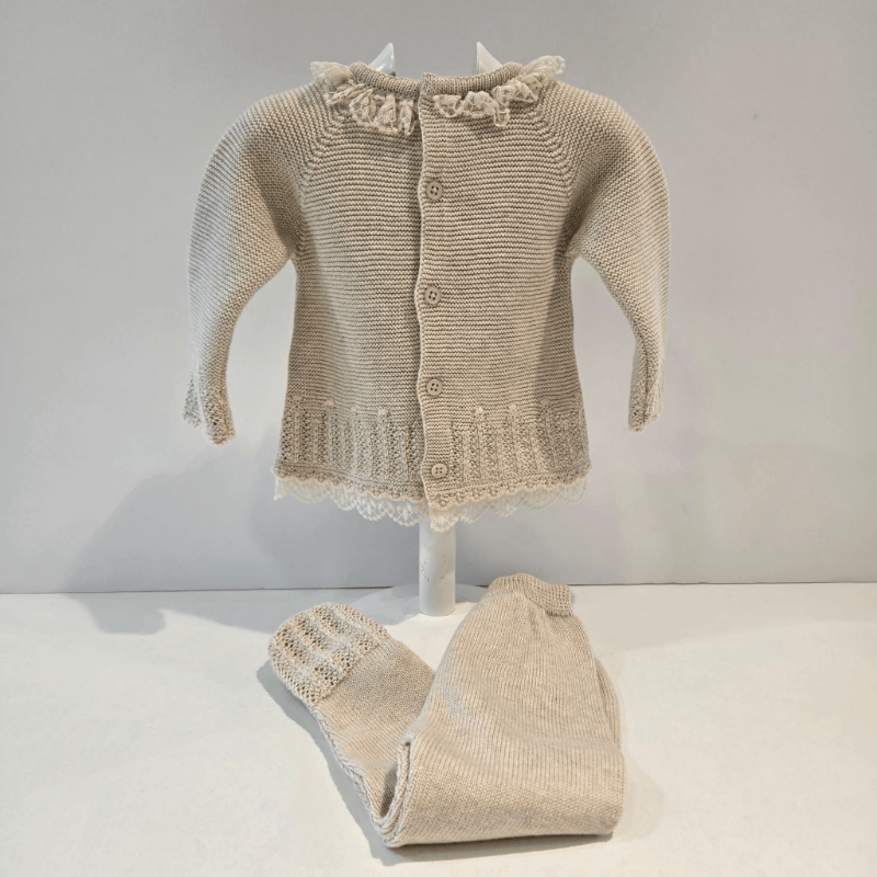 Conjunto de bebé en punto beige, compuesto por jersey de manga larga y polaina con pies. El corte clásico del jersey se realza con detalles artesanales: cuello y bajo con remate de puntilla calada, y cenefa decorativa en el tejido que aporta textura y elegancia. La polaina, en el mismo patrón de punto suave, completa el conjunto con armonía y confort. Ideal para los primeros meses, este diseño combina tradición y ternura en cada puntada. Una propuesta cuidada que forma parte de la selección otoñal de Boutique Luna, donde cada prenda cuenta una historia de mimo y estilo.