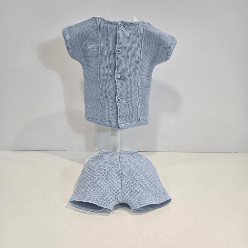Este jubón para niño de la firma Paz Rodríguez está confeccionado en un punto fino y suave de color azul cielo, perfecto para los días templados de primavera y verano. El diseño destaca por su pechito en tela blanca, que aporta contraste y un aire clásico, rematado con dos botones decorativos que realzan la delicadeza del conjunto.