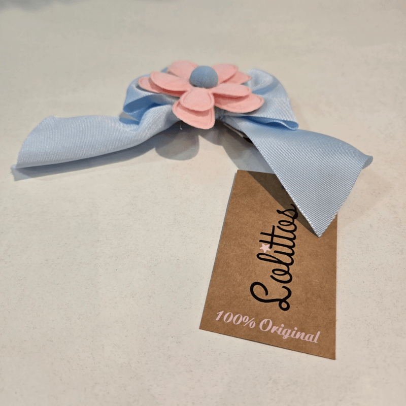 Lazo infantil de la colección Fauna de Lolittos, con corte clásico de doble lazada en cinta azul cielo y patrón liso de textura suave. El centro está adornado con una flor de fieltro rosa empolvado y núcleo azul, que aporta un toque artesanal y delicado. Ideal para complementar conjuntos primaverales, este accesorio destaca por su armonía cromática y su acabado cuidado. Un detalle encantador que forma parte de la selección de complementos.