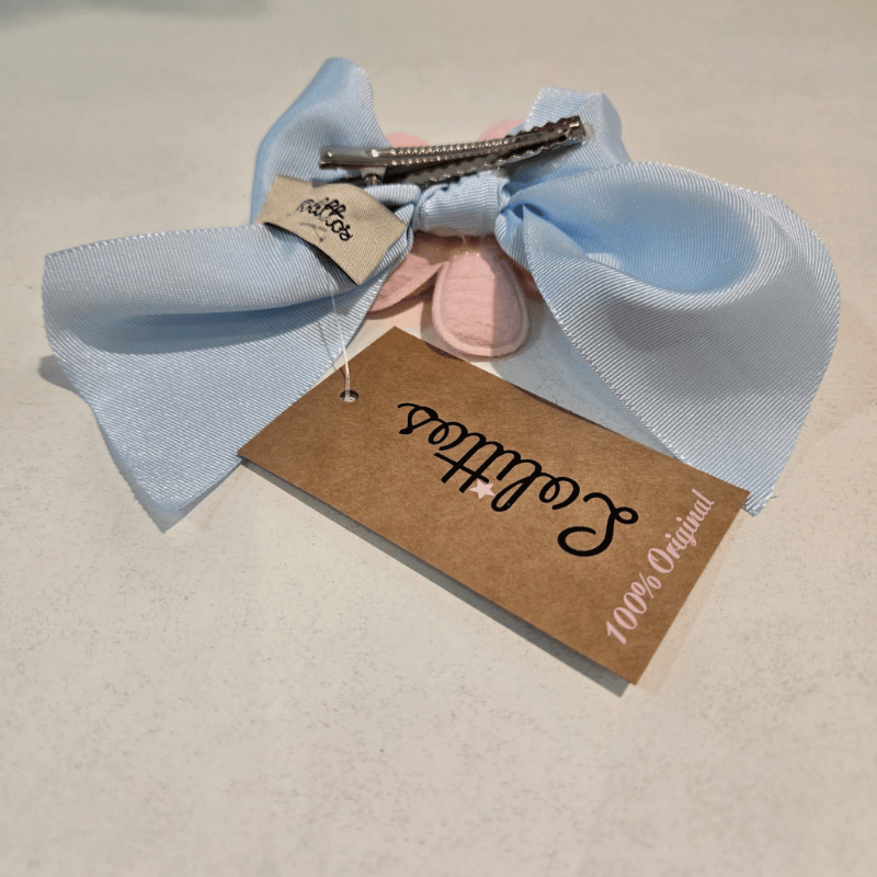 Lazo colección fauna de la firma Lolittos primavera verano 2026. Lazo azul cielo con doble lazada y flor decorativa en rosa empolvado.