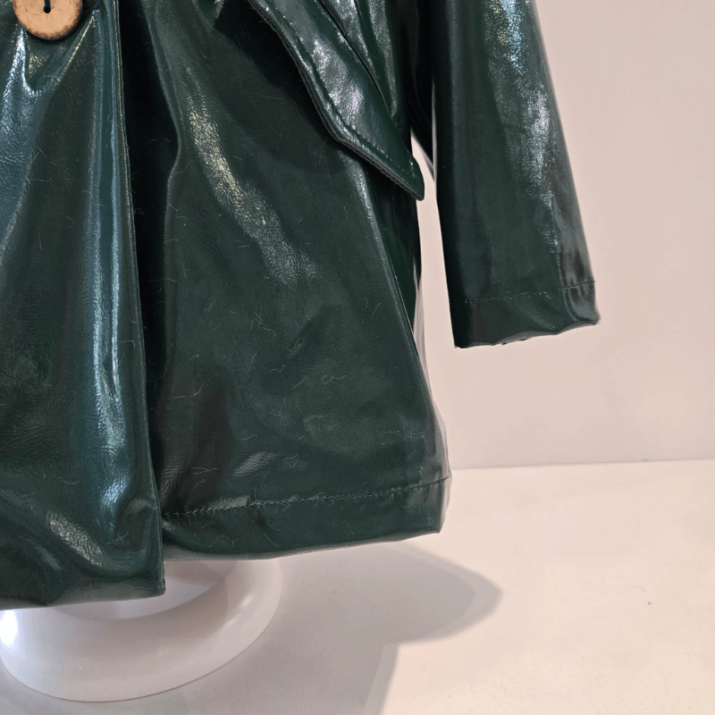 Parka de charol verde con capucha desmontable y forro interior de pelito suave. Corte recto y patrón estructurado que combina abrigo y estilo.