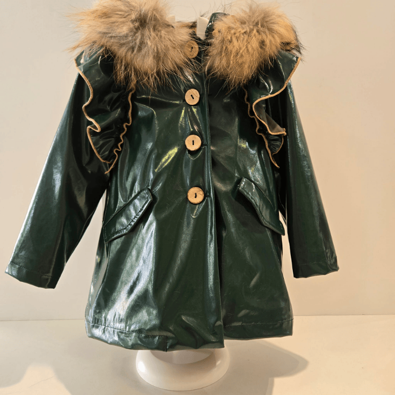 Parka infantil en charol verde botella con capucha desmontable, ribeteada por un suave pelo natural que abraza el rostro con calidez. Su interior está forrado con pelito de poliéster, ligero y acogedor, ideal para los días fríos de otoño e invierno. El corte recto y el patrón estructurado aportan comodidad sin perder elegancia, mientras los detalles en contraste realzan su diseño. Una prenda versátil que se adapta al cambio de estación, pensada para acompañar con estilo cada paseo. Disponible en Boutique Luna, donde cada colección se elige con mimo y mirada poética a la vez que practica para los peques.