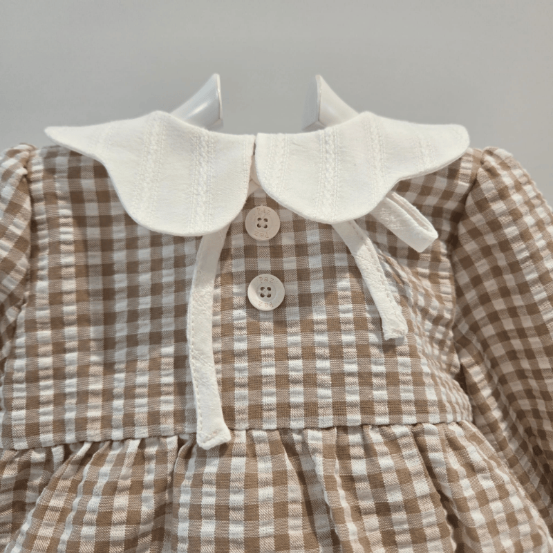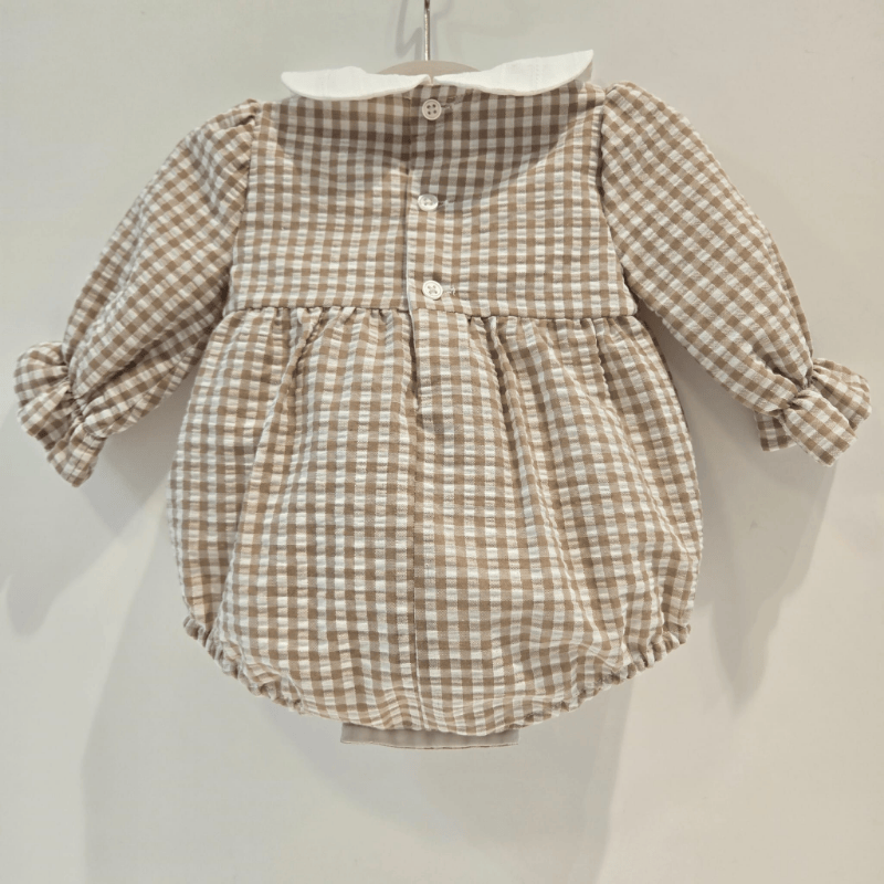 Pelele corto de cuadros en tonos tierra de la firma Paz Rodríguez, ideal para la temporada otoño-invierno. Confeccionado en un tejido de algodón suave con patrón vichy clásico, este diseño combina tradición y ternura. El cuello bebé blanco aporta un toque delicado y elegante, mientras que el lazo decorativo y los botones frontales realzan el estilo vintage del conjunto. Las mangas largas con puño fruncido y el corte abullonado en la parte inferior ofrecen comodidad y libertad de movimiento para los más pequeños. El patrón del tejido aporta textura visual y calidez, y el constructo del corte está pensado para vestir con estilo sin renunciar al confort. Perfecto para para dar un aire distinguido al día a día. Un diseño que refleja el cuidado artesanal y la estética refinada de Paz Rodríguez, pensado para bebés que inspiran dulzura y elegancia.