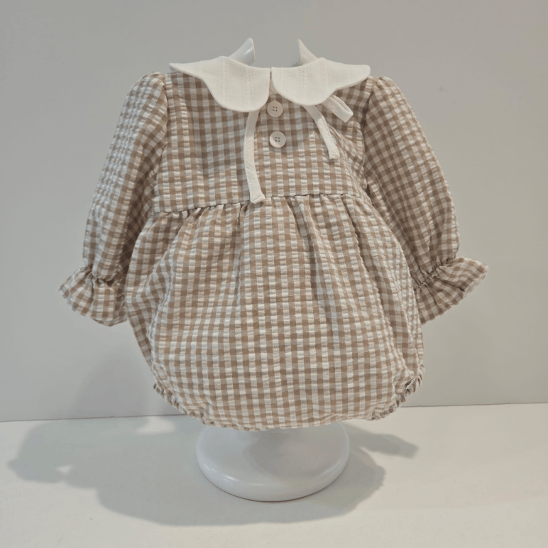 Pelele corto de cuadros con cuello bebé blanco, lazo decorativo y botones frontales. Diseño abullonado y tejido suave con patrón vichy. Elegancia y comodidad para los primeros meses.