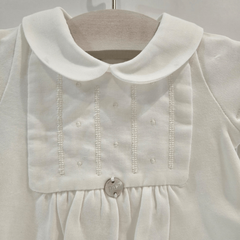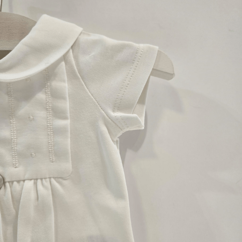 Este pelele corto de niño de Paz Rodríguez es una joya de verano: delicado, fresco y con ese toque clásico que enamora. Pelele corto de niño en blanco puro, con pechera bordada y cuello bebé. Diseño elegante y fresco, ideal para días especiales de verano.