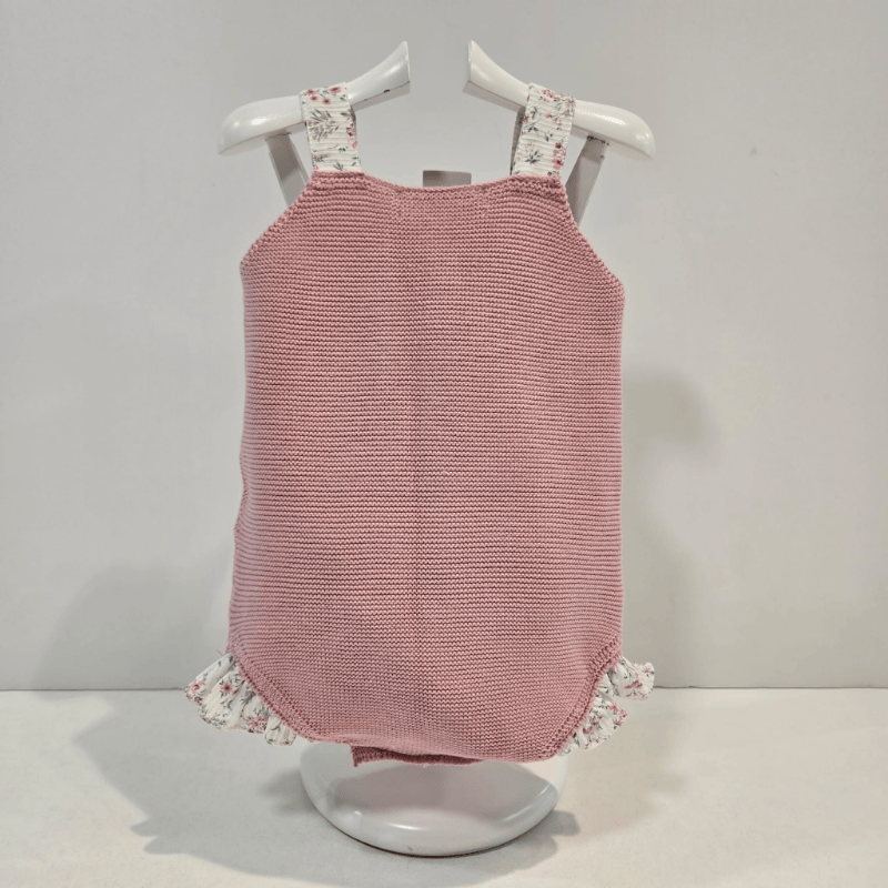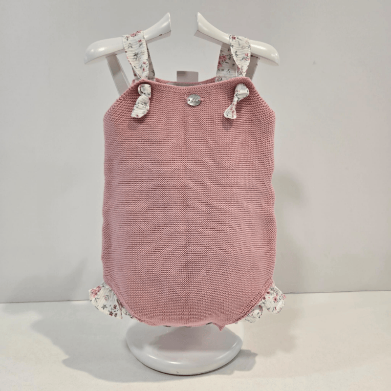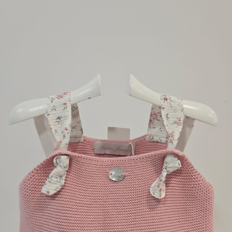 Pelele corto tirante rosa palo Martín Aranda primavera verano. Pelele corto de tirantes de Martín Aranda para primavera–verano, en punto rosa palo con faldita falsa y tirantes en tela floral a juego. Un diseño delicado, fresco y lleno de encanto.