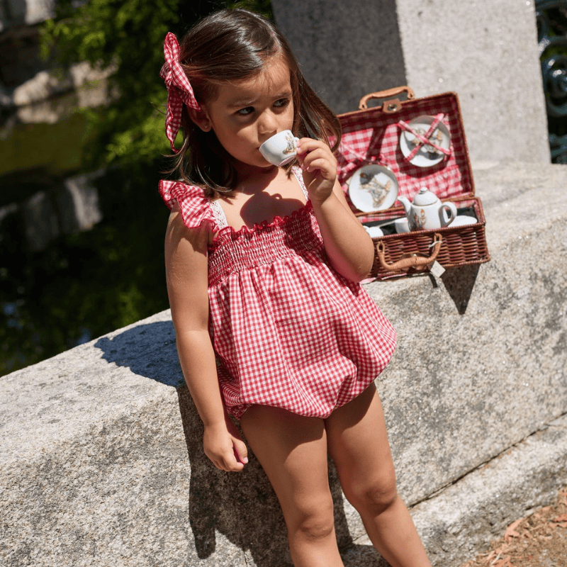 Los tirantes rizados añaden un punto de gracia irresistible, enmarcando los hombros con un aire dulce y veraniego. El diseño permite total libertad de movimiento para jugar, explorar y disfrutar de los días largos al aire libre. El cierre en la entrepierna abotonada facilitan el vestir y desvestir, mantiene siempre la comodidad de la peque. Una prenda ideal para los días de sol, sesiones de fotos, paseos o momentos especiales en familia. La Martinica vuelve a demostrar su maestría creando moda infantil con encanto, calidad y un estilo inconfundible.