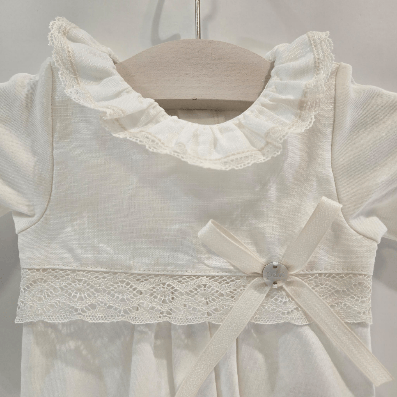Pelele con pie de la firma Paz Rodríguez, ideal para primavera-verano. Confeccionado en tejido suave de punto liso con patrón recto y cómodo, este diseño favorece la libertad de movimiento del bebé sin perder elegancia. El corte clásico se realza con una delicada puntilla frontal y un lazo de grosgrain en tono crudo, adornado con una pequeña flor textil. Las mangas largas terminan en puño fruncido, y el cuello presenta un volante romántico que enmarca el rostro con dulzura. El conjunto transmite una estética limpia y atemporal, perfecta para ocasiones especiales o el día a día con estilo. Cierre trasero con botones para facilitar el cambio. Una pieza que combina tradición y ternura, pensada para mimar a los más pequeños con el sello de calidad de Paz Rodríguez.