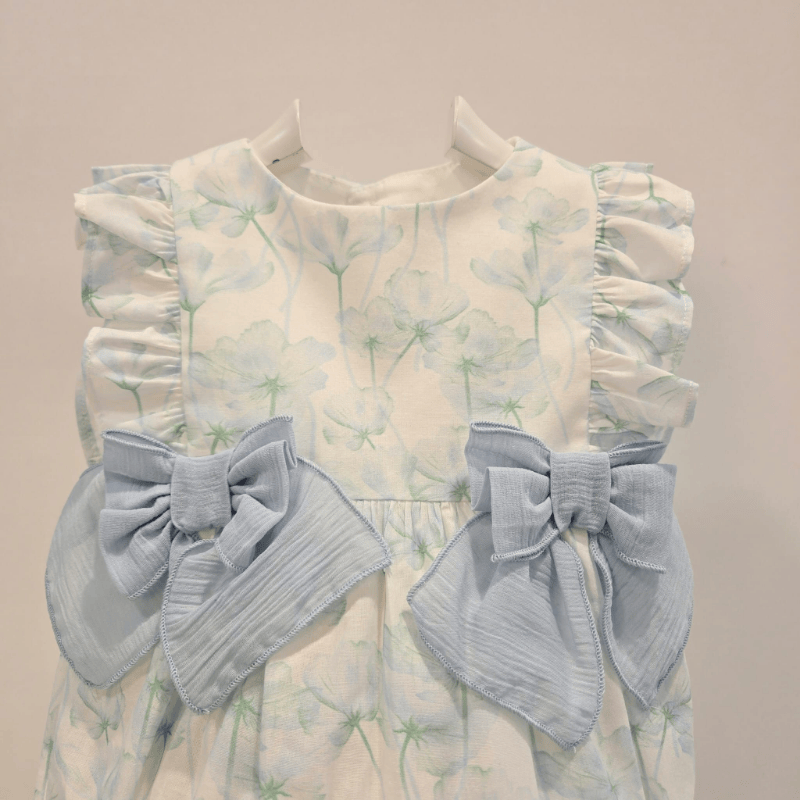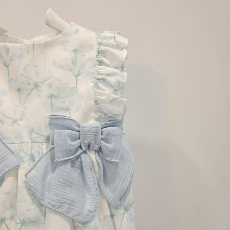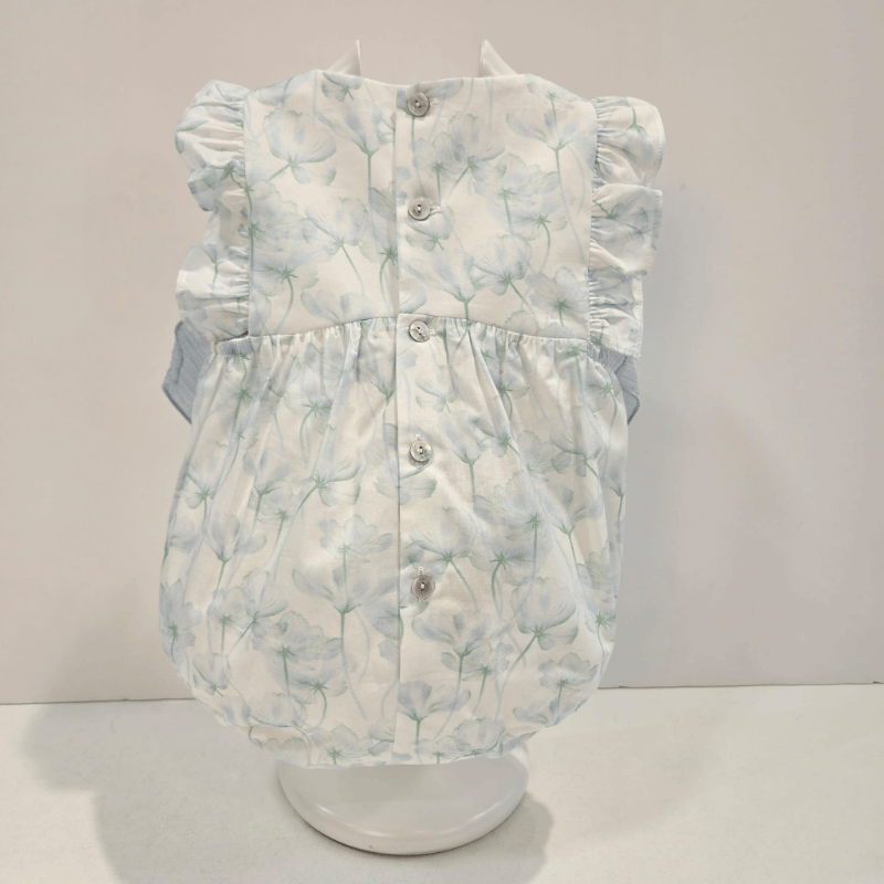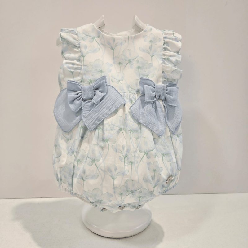 Pelele Martin Aranda manga rizada dos lazos primavera verano. Pelele de Martin Aranda para primavera–verano, con mangas rizadas, dos lazos decorativos en la cintura y un delicado estampado floral en tonos suaves. Ligero, cómodo y lleno de encanto clásico. Un soplo de verano vestido de flor