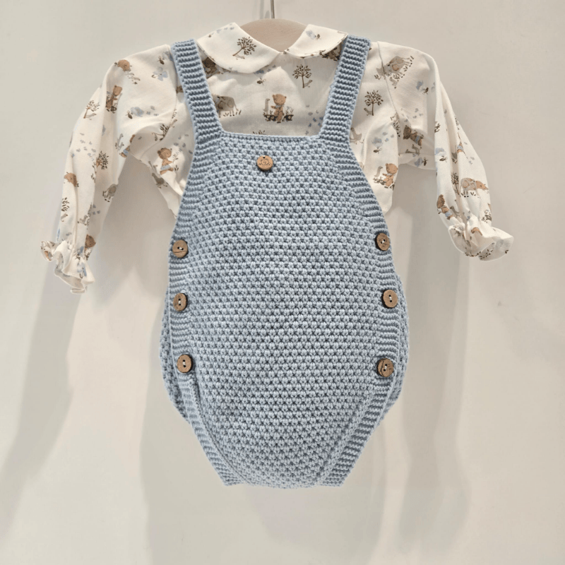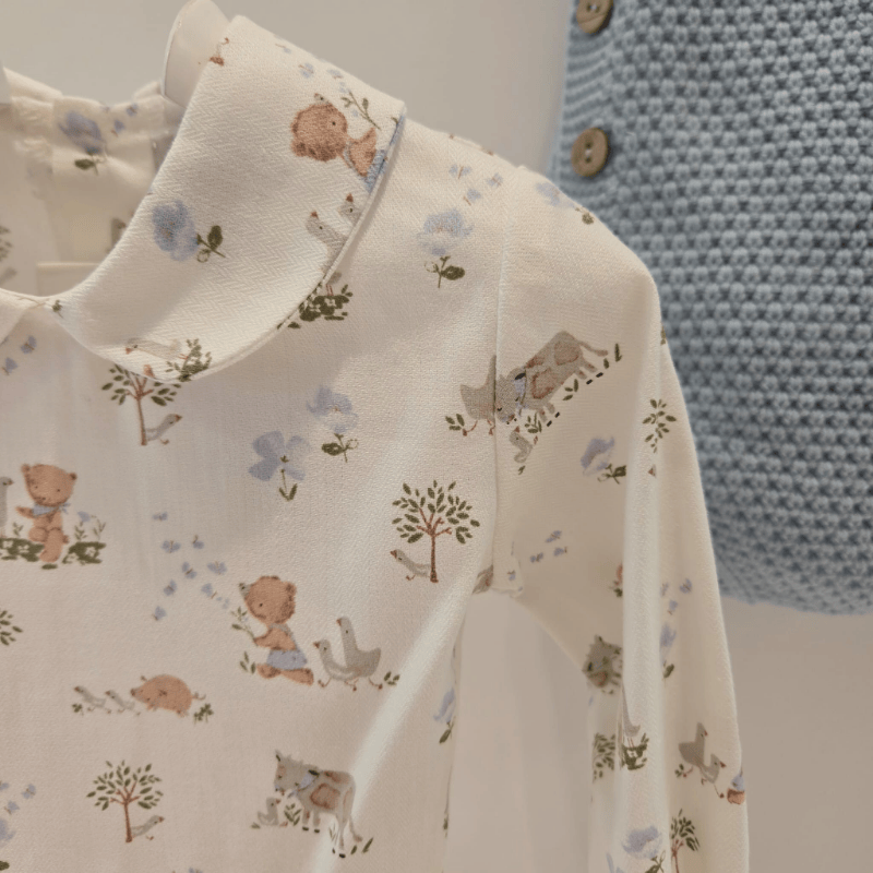 Conjunto Pangasa invierno compuesto por peto azul y camisa estampada con animalitos. El peto está confeccionado en punto tricot de algodón suave, con patrón de canalé fino que aporta elasticidad y confort. Su corte recto y tirantes ajustables permiten libertad de movimiento y un ajuste perfecto. La camisa, en popelín de algodón, presenta un estampado delicado de animalitos en tonos tierra y azul, con cuello bebé y cierre trasero con botones. Ideal para los días frescos, este conjunto combina tradición y ternura con un diseño funcional y elegante. Perfecto para ocasiones especiales o paseos cotidianos, con acabados cuidados y tejidos pensados para la piel delicada del bebé.