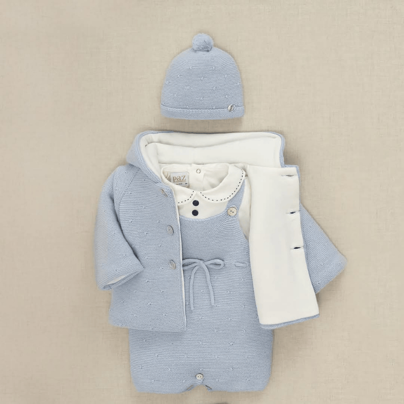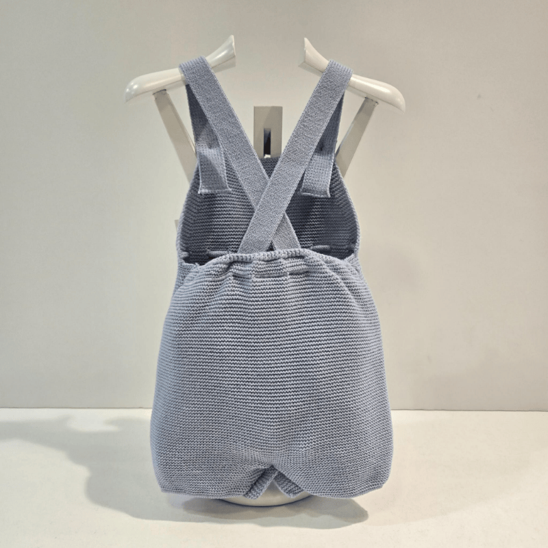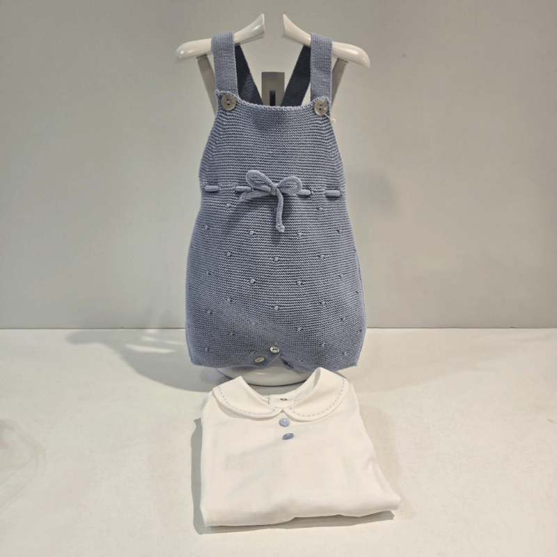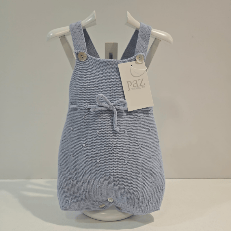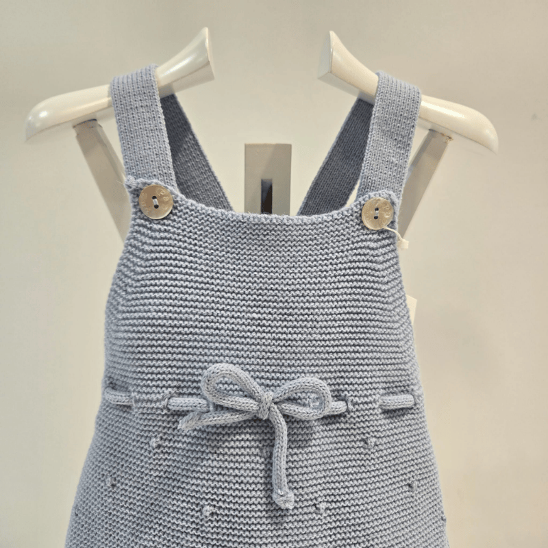 Este peto tipo ranita de la colección Erizos de Paz Rodríguez es una pieza delicada en azul tiza, ideal para los días frescos de otoño e invierno. Confeccionado en punto fino con patrón de bodoques bordados, su corte recto y tirantes con botones aportan comodidad y estilo clásico. El lazo decorativo en la cintura añade un toque encantador sin perder sobriedad. Perfecto para combinar con blusas o leotardos, este diseño refleja la ternura de la firma y el cuidado artesanal. Disponible en Boutique Luna, donde cada prenda se elige con amor y atención al detalle.