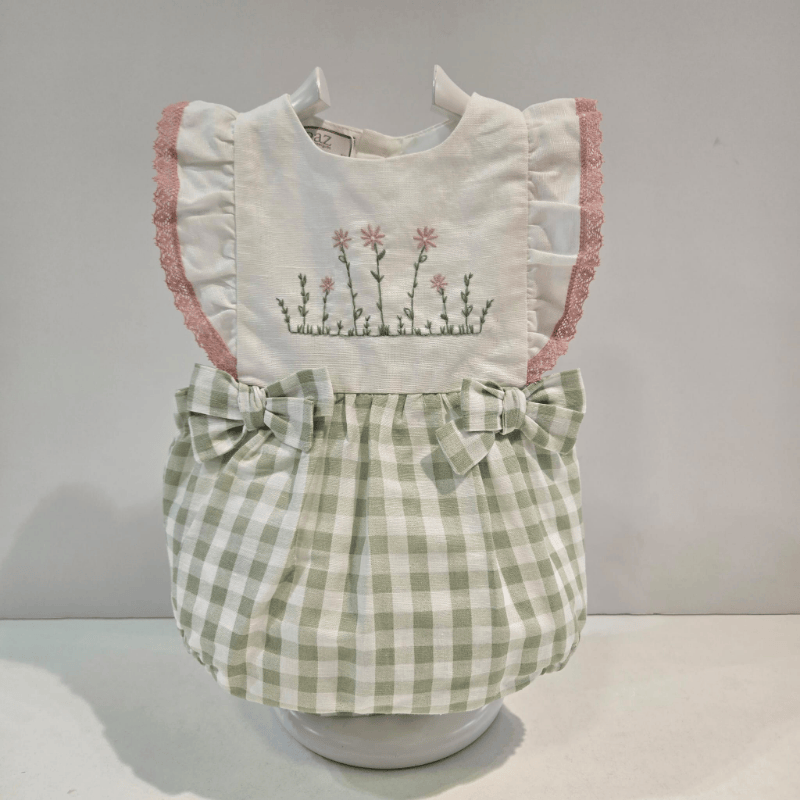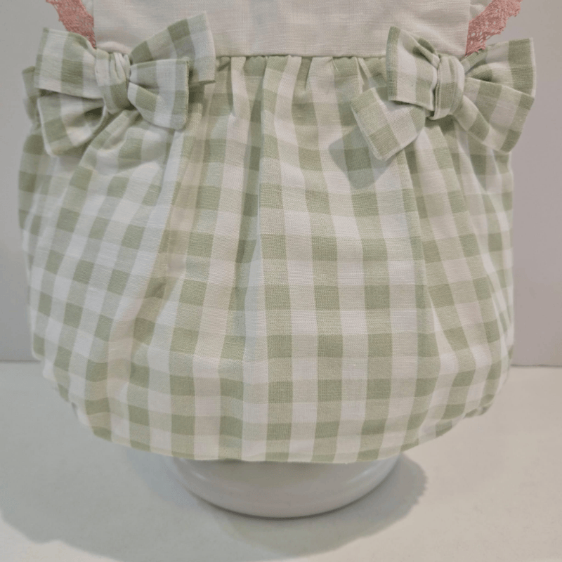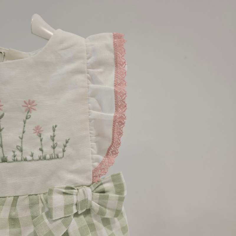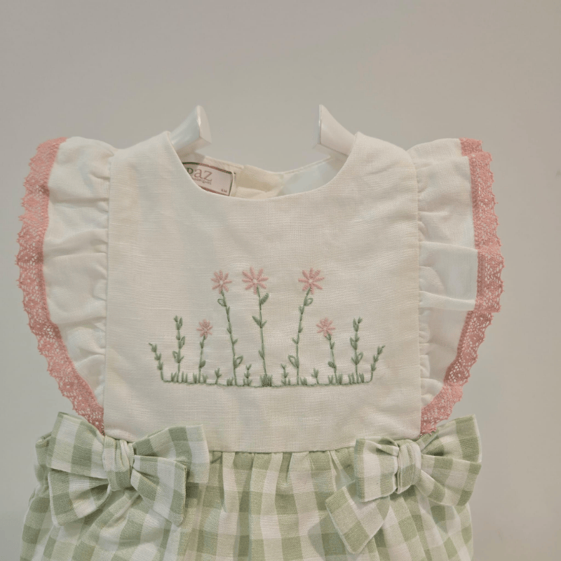 Ranita bebé Paz Rodríguez en tejido liso bordado y vichy verde, con volantes, lazos decorativos y bordado floral.