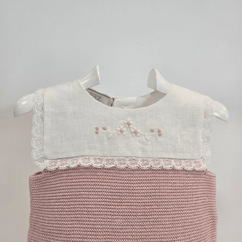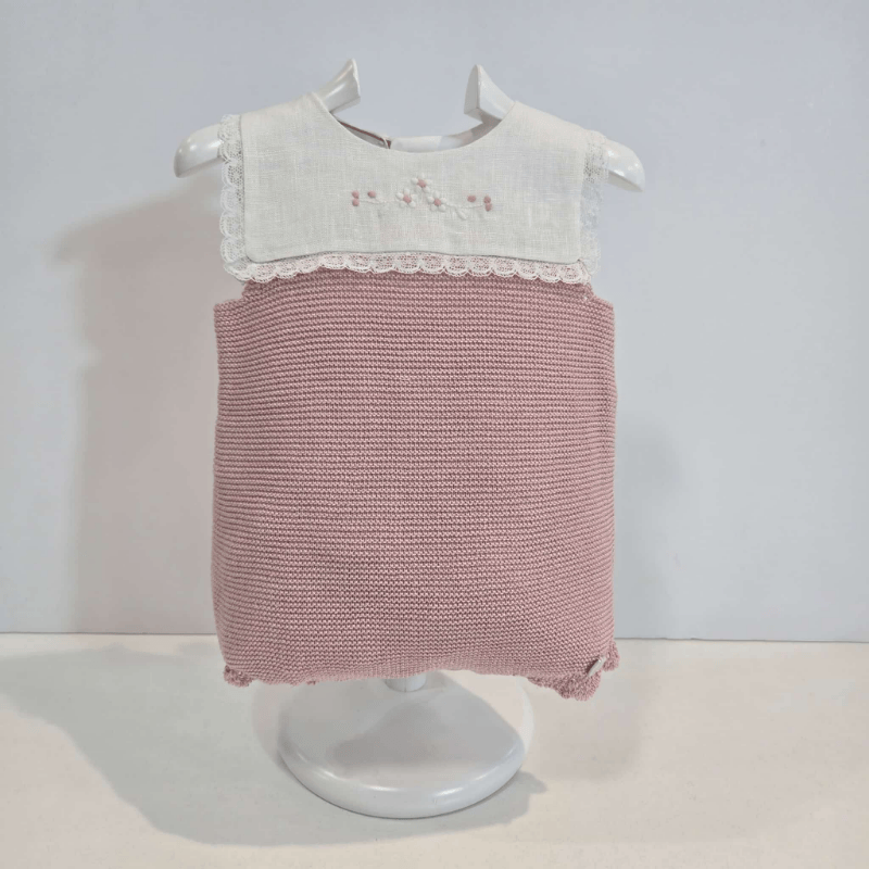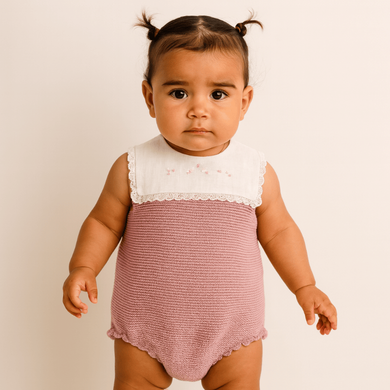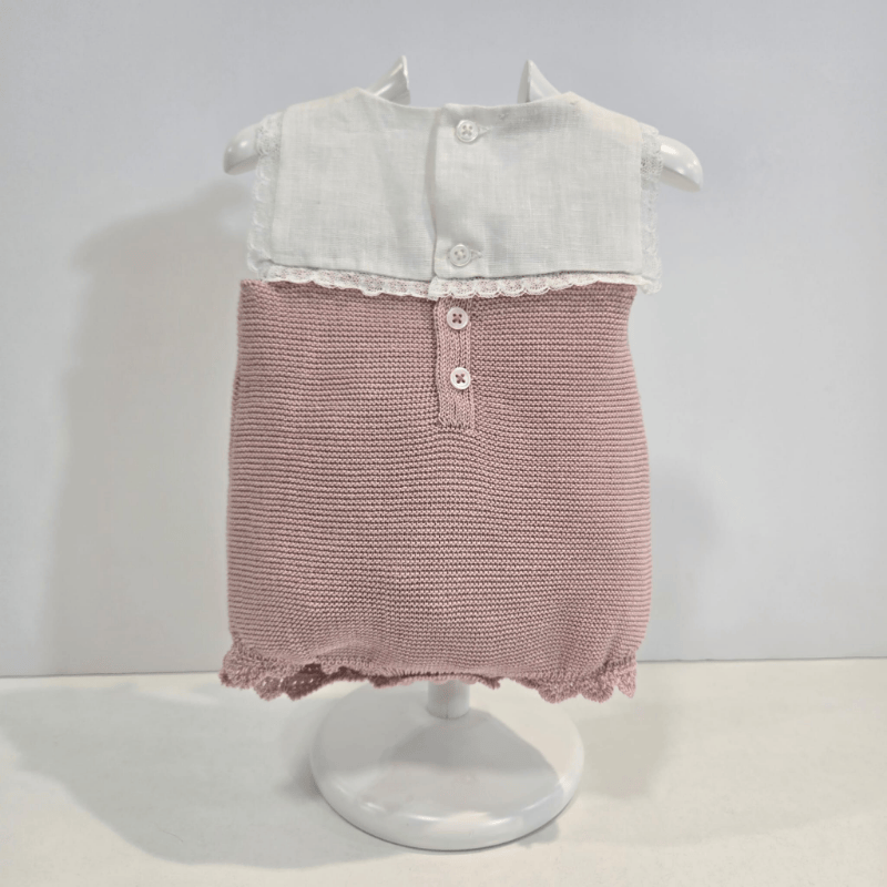 Una ranita que parece susurrar dulzura desde el primer vistazo. El cuerpo en tela blanca bordada con pequeñas flores rosadas está rematado por una puntilla fina que enmarca el escote con elegancia. La parte inferior, tejida en punto rosa empolvado, aporta calidez y textura, creando un contraste suave y armonioso.