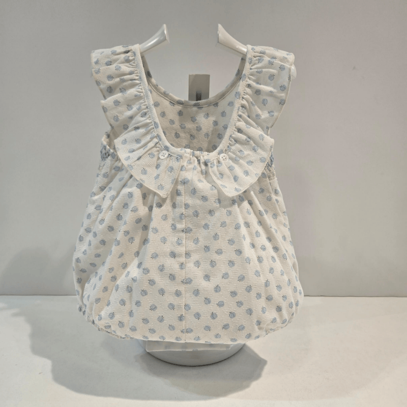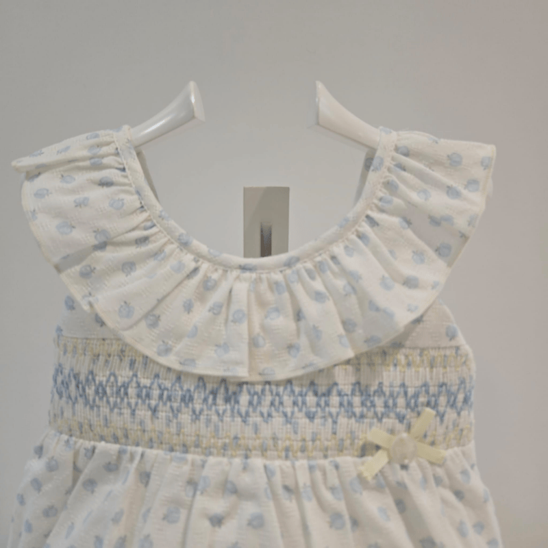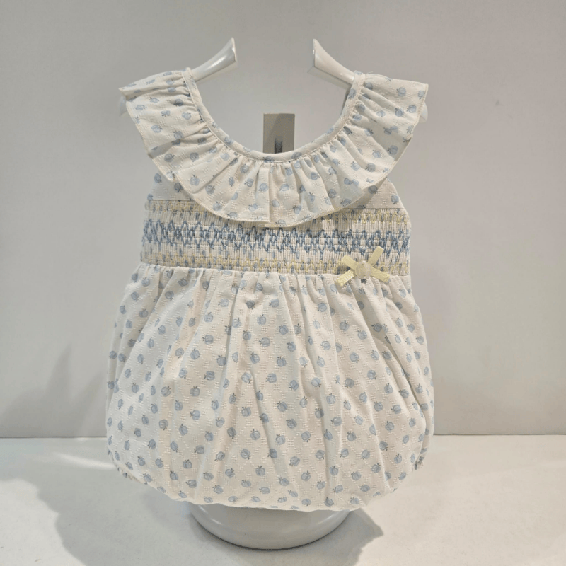 Ranita bombacho blanca con frutitas azules, nido de abeja bordado en azul y amarillo, cuello volante y lacito decorativo. Colección Eden de Paz Rodríguez.