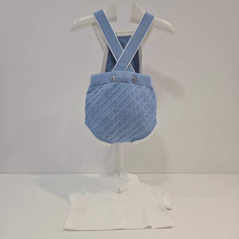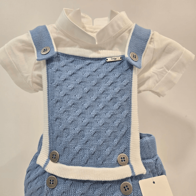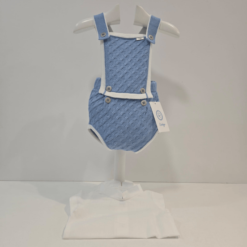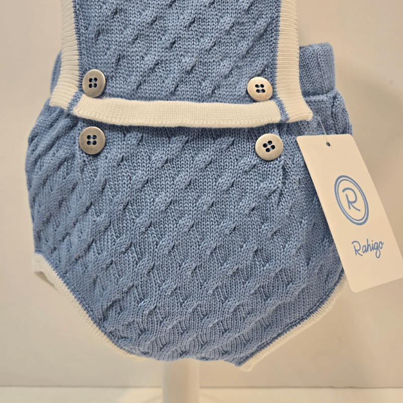 Ranita niño punto azul-beige de Rahigo primavera verano. Ranita de punto para niño en color azul con delicados ribetes en beige, de Rahigo. Diseño clásico y fresco para primavera–verano, con tejido suave, botones decorativos y tirantes cruzados. Una prenda cómoda, elegante y perfecta para los días luminosos de la temporada.