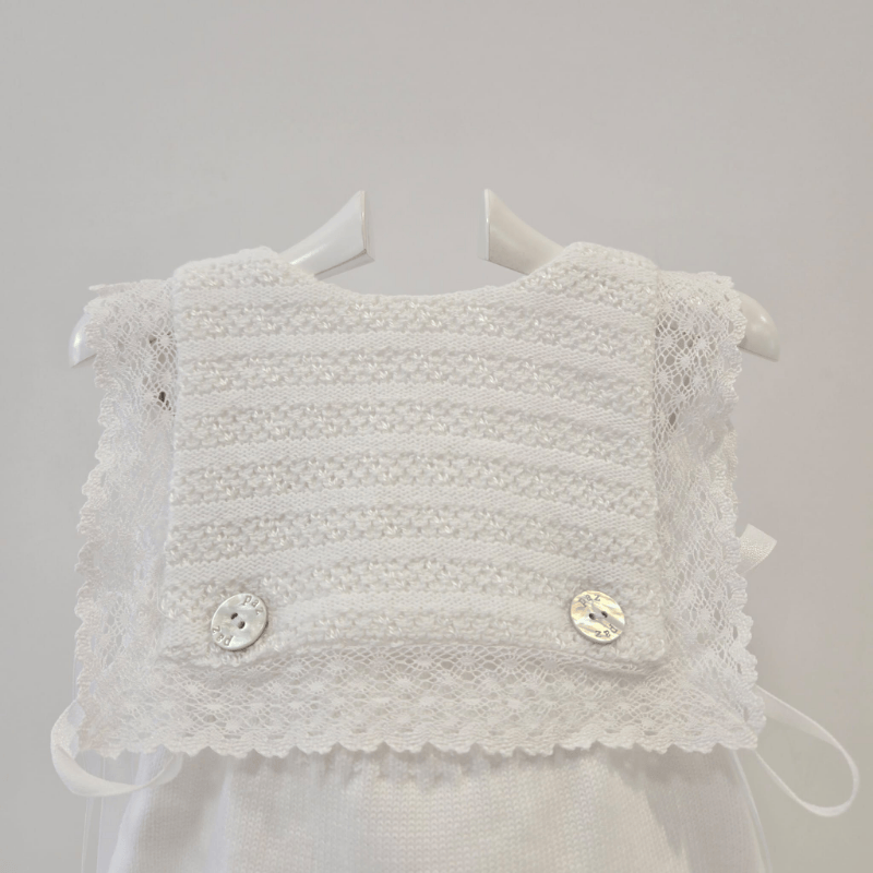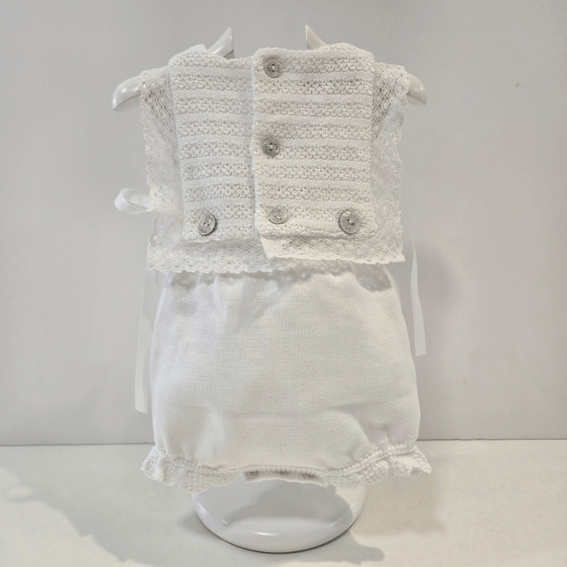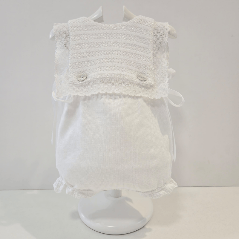 Ranita punto blanco alaia pechera encaje Paz Rodríguez verano. Ranita en punto blanco de la colección Alaia de Paz Rodríguez, con pechera ribeteada en encaje y acabado suave y fresco para los días cálidos. Una prenda clásica, luminosa y delicada para los primeros paseos de la temporada.