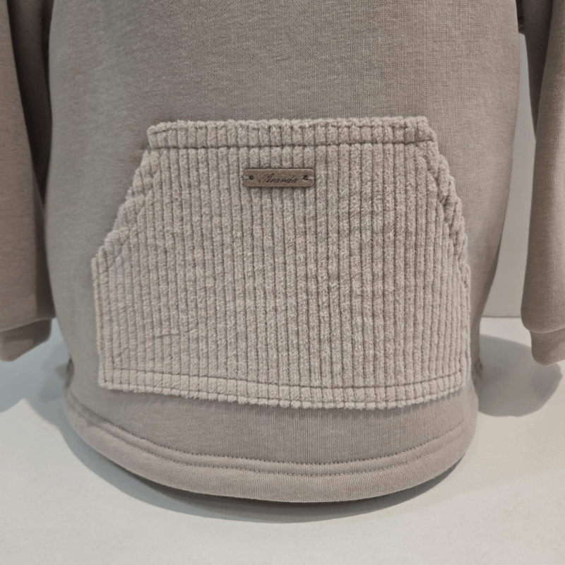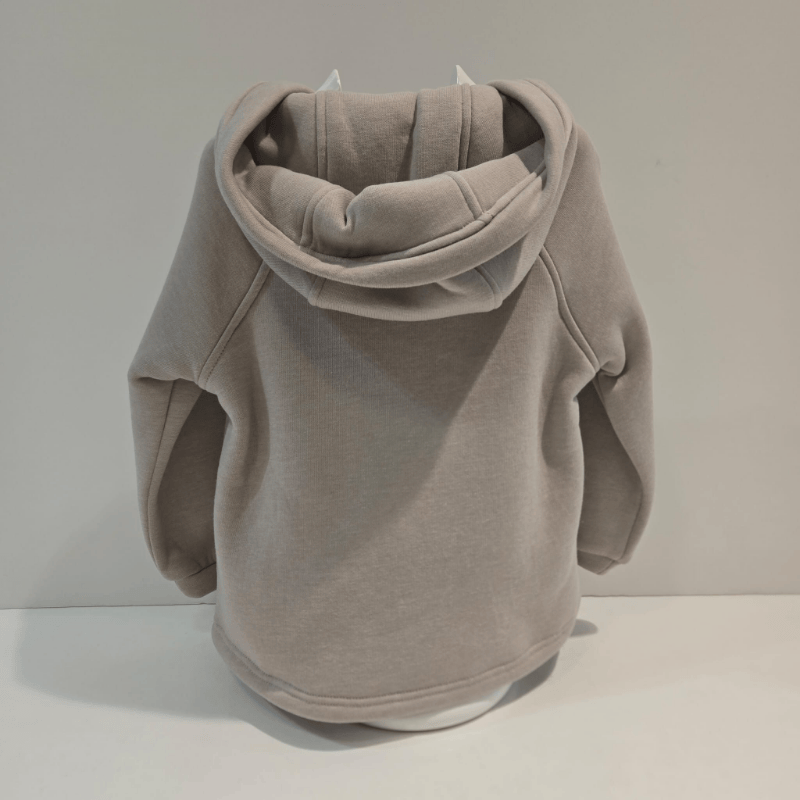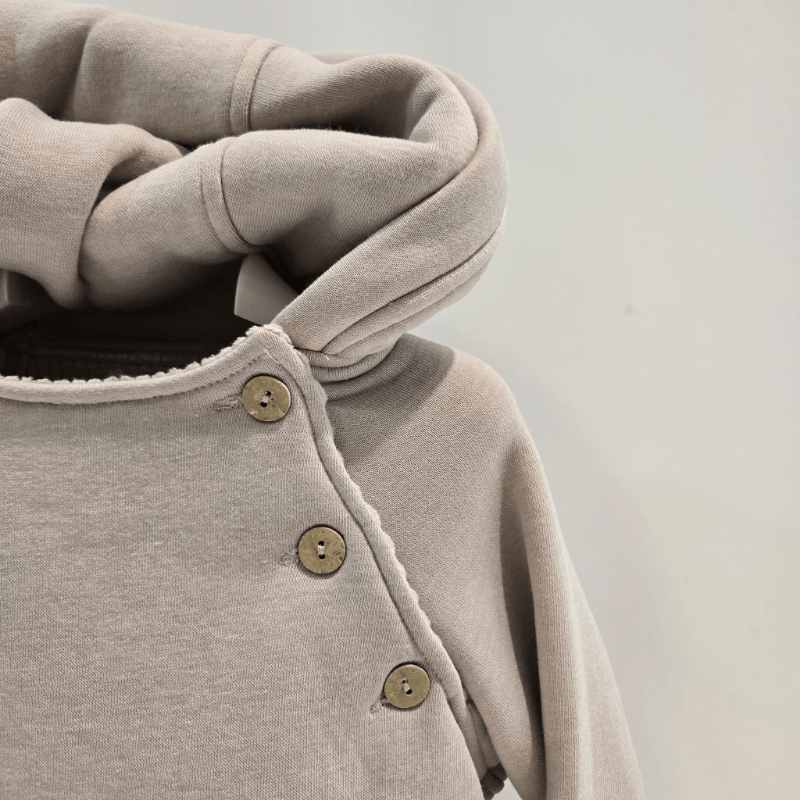 Sudadera con capucha en color arena, confeccionada en tejido de punto con patrón espigado. Corte estructurado con botonadura doble y bolsillo frontal texturizado. Ideal para otoño-invierno.