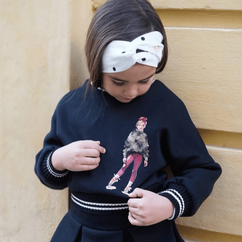 La sudadera corta de la colección Delia de Noma Fernández es una pieza audaz y moderna que combina estilo urbano con el encanto característico de la firma gallega. Confeccionada en felpa negra de alta calidad, esta prenda destaca por su corte cropped que realza la silueta y aporta un aire desenfadado y juvenil. El patrón del tejido es liso, suave al tacto y con cuerpo suficiente para mantener la estructura sin perder comodidad. Los puños y el bajo están rematados con canalé elástico en rayas blancas y negras, aportando contraste y un guiño deportivo. La manga izquierda se convierte en protagonista gracias a un original estampado gráfico: una figura con chaqueta peluche, pantalón rojo y calzado urbano, que añade un toque artístico y rompedor al diseño. El cuello redondo y las mangas largas completan una construcción pensada para el día a día con estilo. Esta sudadera es una declaración de moda para las niñas que quieren destacar con personalidad en los meses fríos y es de la temporada otoño invierno 2025/26
