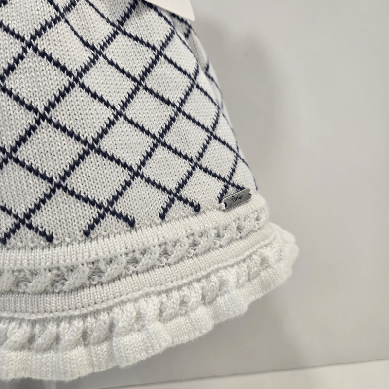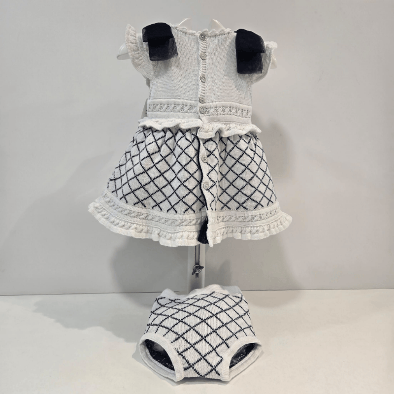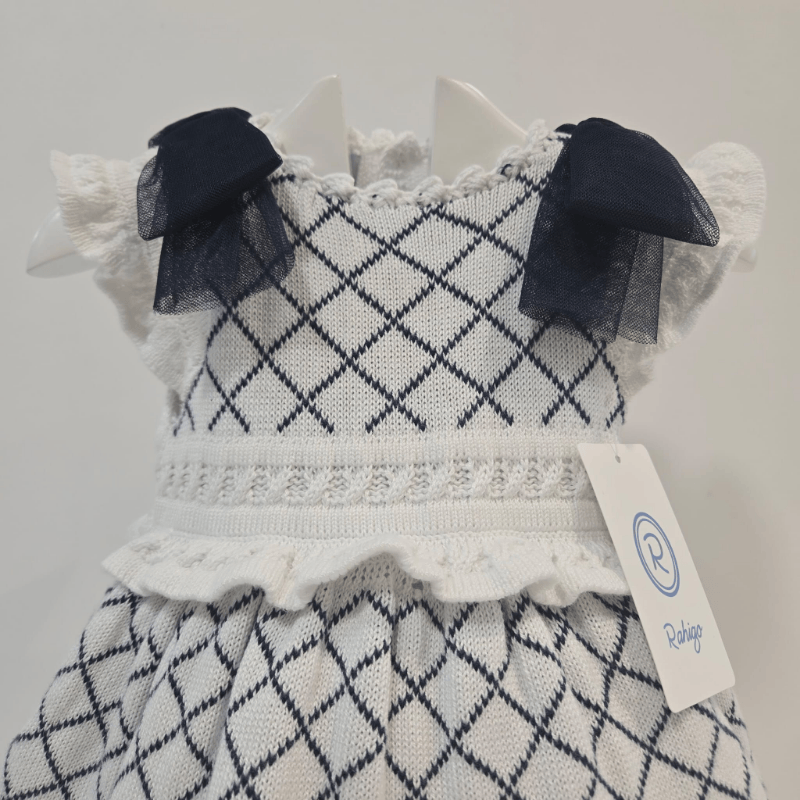 Vestido blanco y azul rombos Rahigo primavera verano. Este vestido de Rahigo en blanco con detalles en negro es una pequeña obra de arte pensada para brillar en primavera y verano. El cuerpo, suave y delicado, luce un punto impecable que abraza sin pesar, mientras los rombos en contraste aportan ese aire clásico y elegante que tanto caracteriza a la firma. Las lazadas negras en los hombros añaden un toque teatral y dulce, como un guiño coqueto que enmarca la carita de la peque. La falda, con su vuelo ligero y remate ondulado, acompaña cada movimiento con gracia. Incluye su braguita a juego, perfectamente coordinada para un conjunto armonioso y muy especial. Una pieza pensada para días luminosos, celebraciones familiares y momentos que se guardan en la memoria.