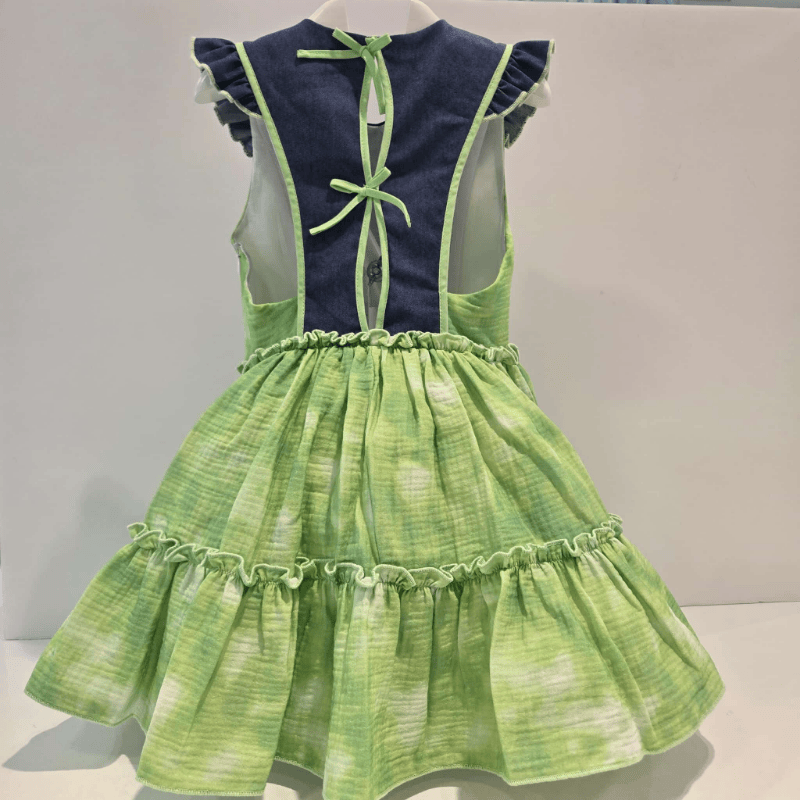 Vestido colección denim azul y verde lolittos verano 2025. La parte de la falda y los paneles laterales están hechos de una tela verde con un diseño tie-dye que le da un toque moderno y dinámico. Además, tiene un patrón sutil blanco degradado que le aporta textura. El vestido cuenta con volantes que adornan las sisas y la línea de la cintura. Además, la falda tiene dos niveles de volantes, lo que agrega volumen y movimiento al diseño. Adema se presenta con los acabados del vestido impecables, con costuras limpias y precisas que resaltan la calidad de la confección y es de la firma Lolittos de su nueva colección primavera-verano 2025