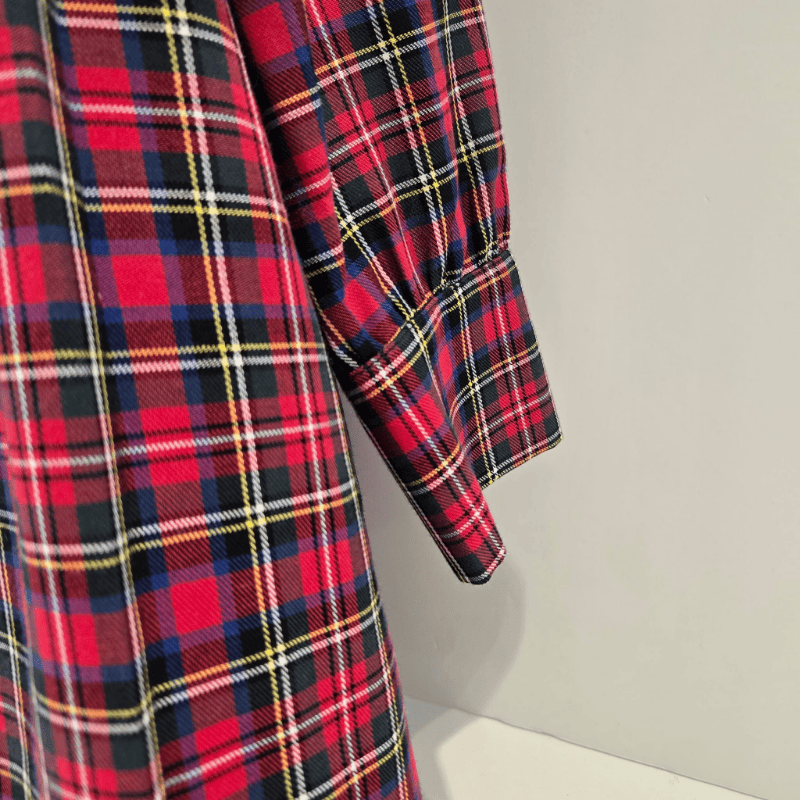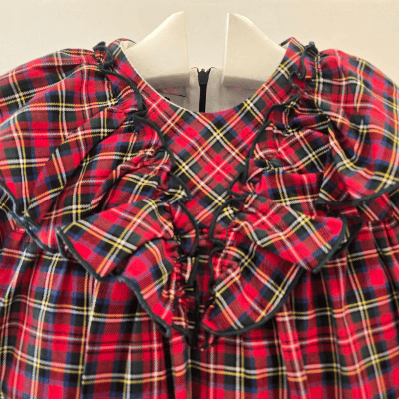 Vestido tartán de corte holgado con cuello volante y encaje, patrón de cuadros rojos, azules y blancos. Colección Hilton AW25/26.