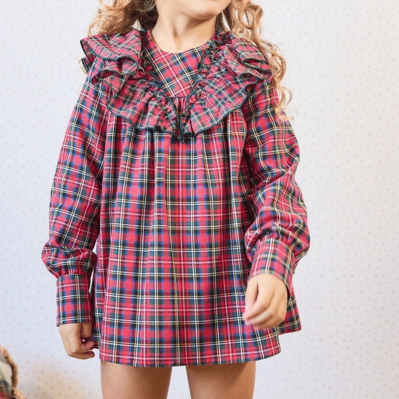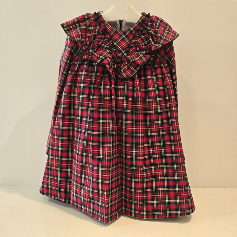 Vestido de niña de la colección Hilton de La Martinica para otoño-invierno 25/26, confeccionado en tejido tartán de algodón suave con patrón de cuadros rojos, azules y blancos. Su corte holgado y elegante incluye mangas largas con puño fruncido y un cuello volante que enmarca el pecho con delicado encaje negro. El diseño favorece la comodidad sin perder el encanto clásico, ideal para los días frescos con estilo. El patrón se alinea cuidadosamente en las costuras, mostrando la atención al detalle de la marca. Disponible en Boutique Luna, donde cada prenda se elige con mimo para vestir la infancia con personalidad.