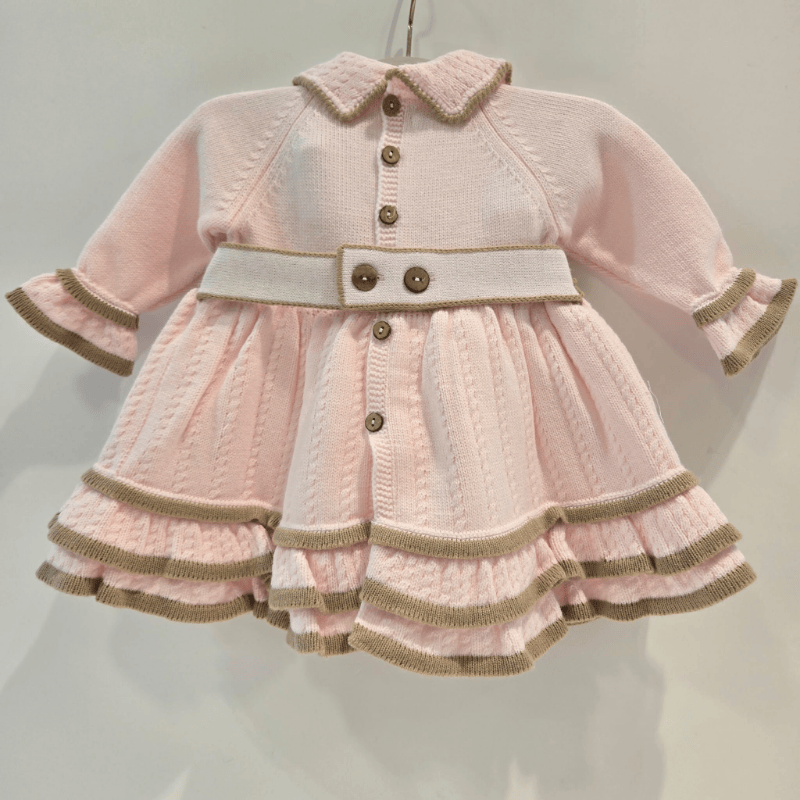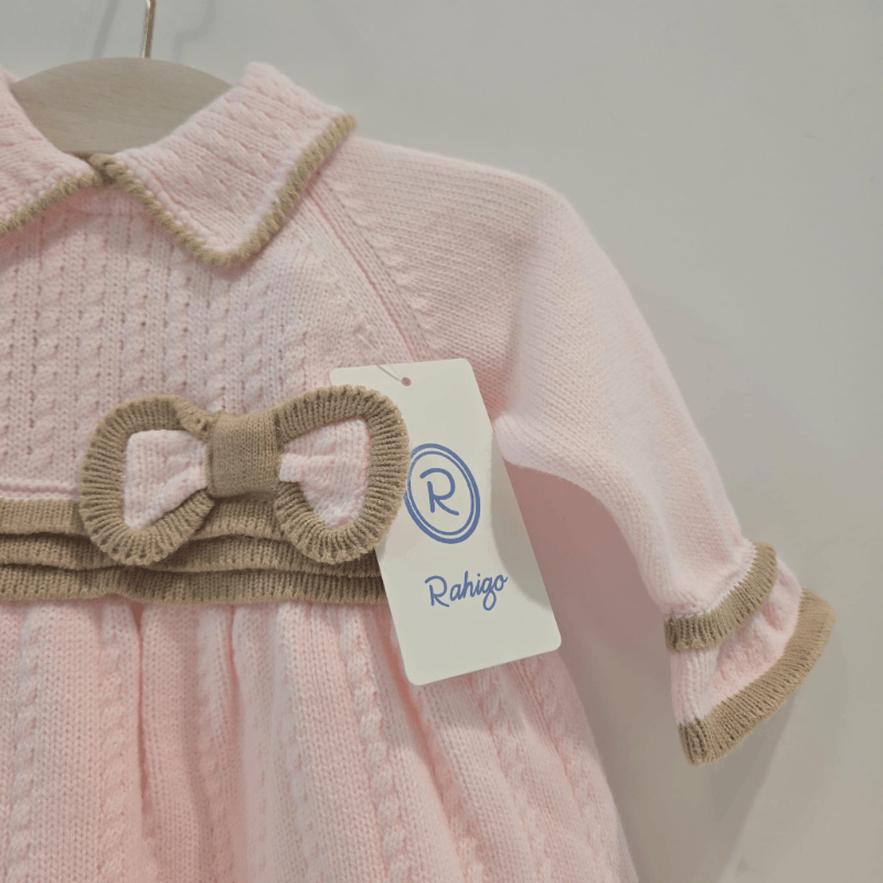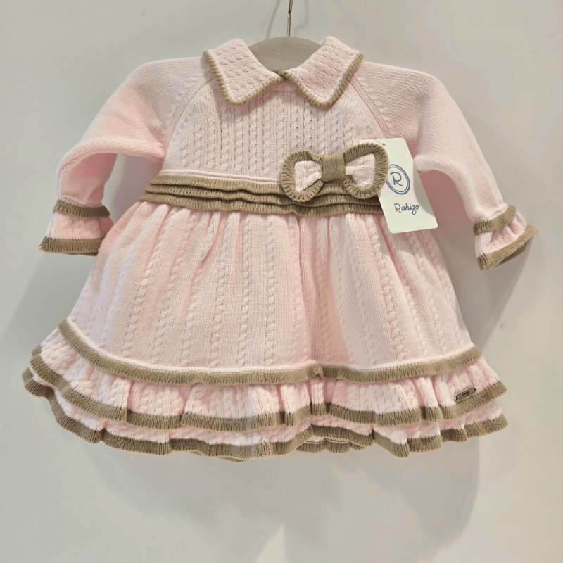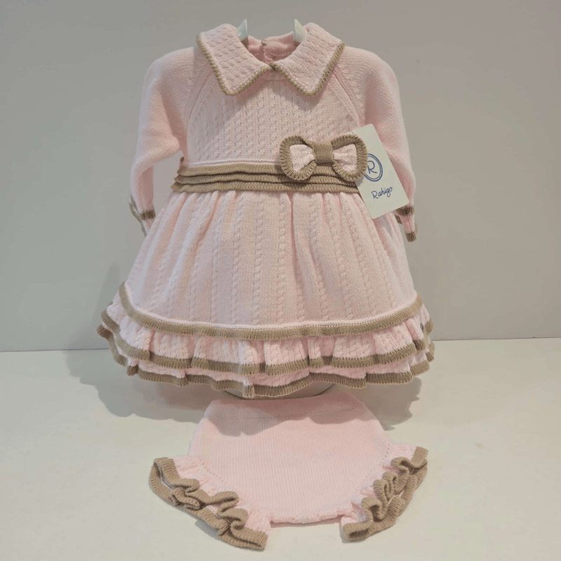 Vestido con braguita Rahigo en rosa y camel, ideal para otoño/invierno. Corte clásico con cuello Peter Pan, tejido de punto con textura, volantes y lazo decorativo. Elegancia y confort para las más pequeñas.