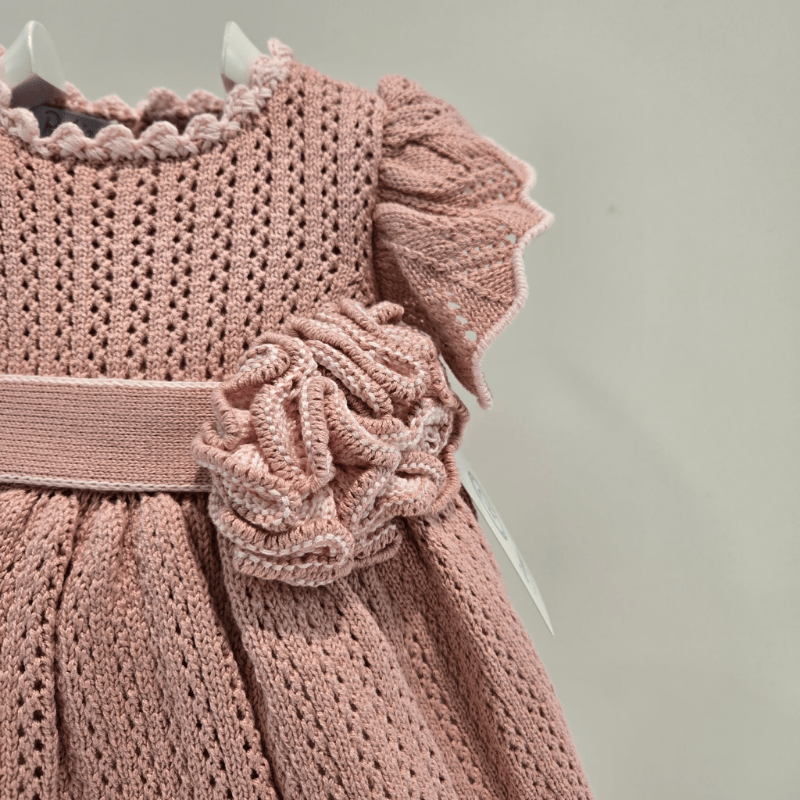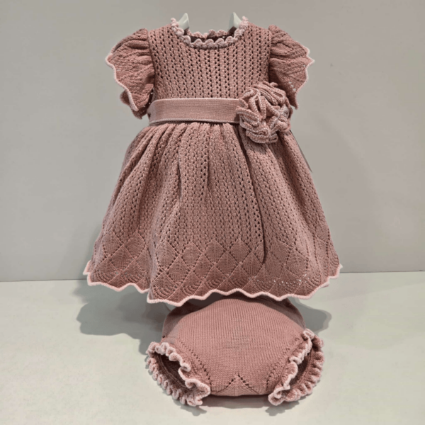 Vestido con braguita rosa de Rahigo verano, Este precioso vestido de la firma Rahigo en rosa palo, confeccionado en punto, se presenta acompañado de una braguita a juego del mismo tejido. Las mangas abombachadas añaden un toque encantador al diseño, rematadas con delicadas ondas en los bordes en *rosa claro, detalle que también se repite en el cuello y en la cinta decorativa que atraviesa el centro del vestido. Este «cinturón» destaca por llevar una gran flor como protagonista, armonizando elegantemente ambos tonos de rosa. El dobladillo del vestido está elaborado con un remallado ondulado en rosa claro, manteniendo la coherencia estética en cada detalle. La parte inferior de la falda, además, luce un bordado de rombos, tejido en el mismo punto. Ideal para cualquier ocasión durante la temporada primavera-verano y es de la firma Rahigo.