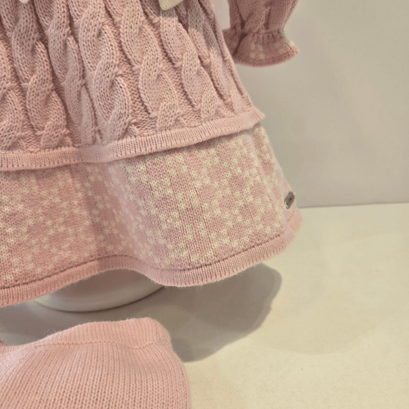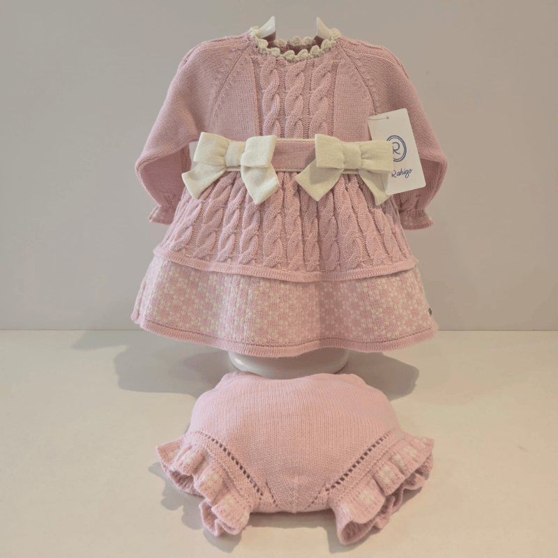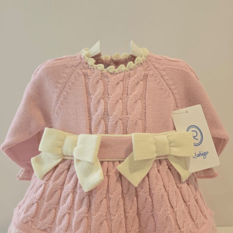 Vestido con pololo en tono rosa y caña de la firma Rahigo, ideal para la temporada otoño/invierno 25/26. El corte clásico se combina con un patrón de punto trabajado en el cuerpo y las mangas, mientras la falda en tela con diseño sutil aporta movimiento y dulzura. El conjunto incluye braguita a juego con volantes, creando armonía y delicadeza en cada detalle. El tejido mezcla calidez y textura, pensado para ocasiones especiales y días de paseo. Una propuesta que une tradición y ternura, disponible en Boutique Luna, donde cada prenda se elige con mimo.