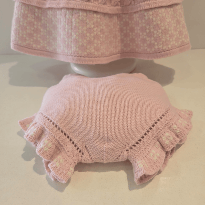 Vestido rosa con pololo a juego. Corte clásico y patrón de punto en cuerpo y mangas, combinado con falda de tela ligera y braguita con volantes.