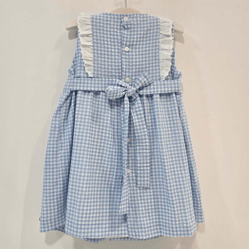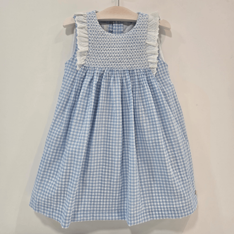 Vestido cuadros con nido de abeja colección anade verano. Vestido de cuadros azul y blanco de la colección Anade de Paz Rodríguez, con nido de abeja bordado y volantes de puntilla.