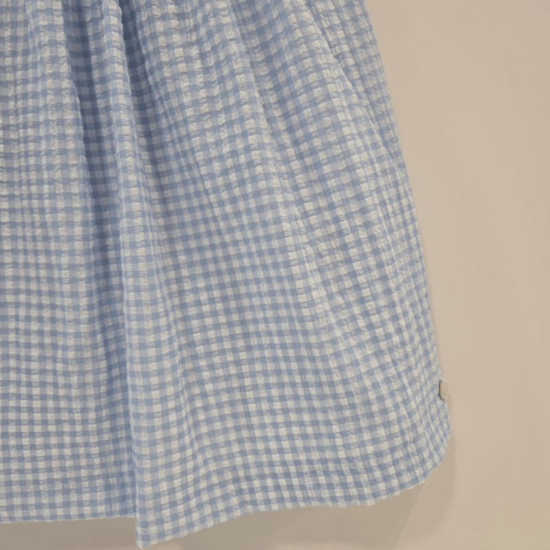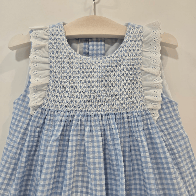 Vestido cuadros con nido de abeja colección anade verano. Este vestido de cuadros de la colección Anade de Paz Rodríguez combina tradición, frescura y un encanto muy veraniego. Confeccionado en un tejido ligero de cuadros azul y blanco, destaca por su cuerpo con nido de abeja bordado, que aporta textura y un toque artesanal característico de la firma. Los volantes de puntilla blanca en los hombros añaden un aire romántico y delicado, creando un contraste suave y muy femenino. La falda, ligeramente fruncida, ofrece movimiento y comodidad, perfecta para los días luminosos de primavera y verano. Es una prenda versátil y cuidada, ideal tanto para ocasiones especiales como para paseos y momentos cotidianos en los que se busca un look dulce, cómodo y atemporal.