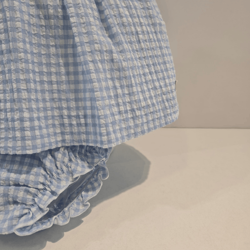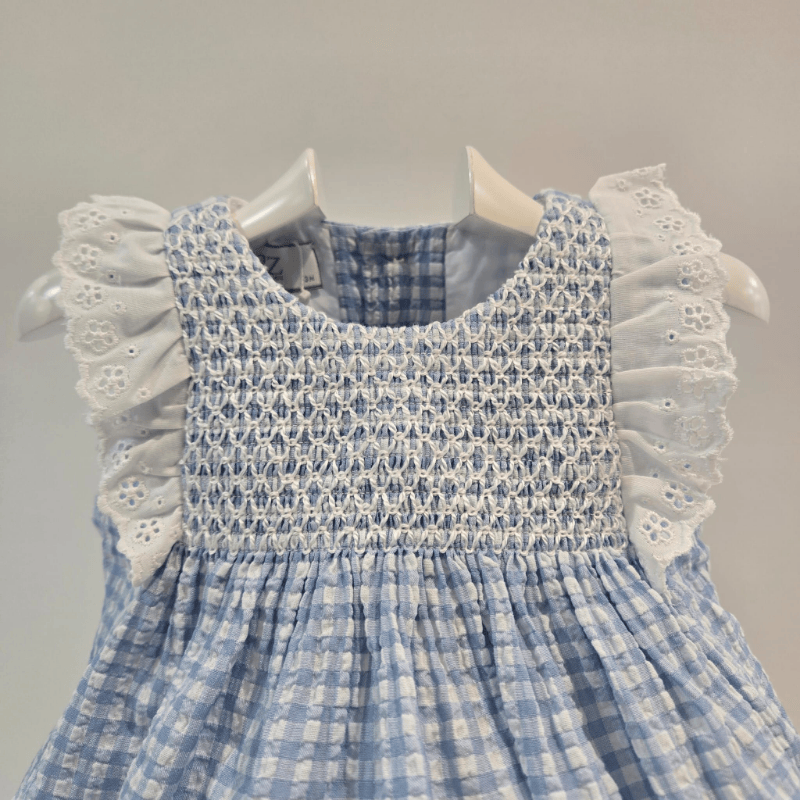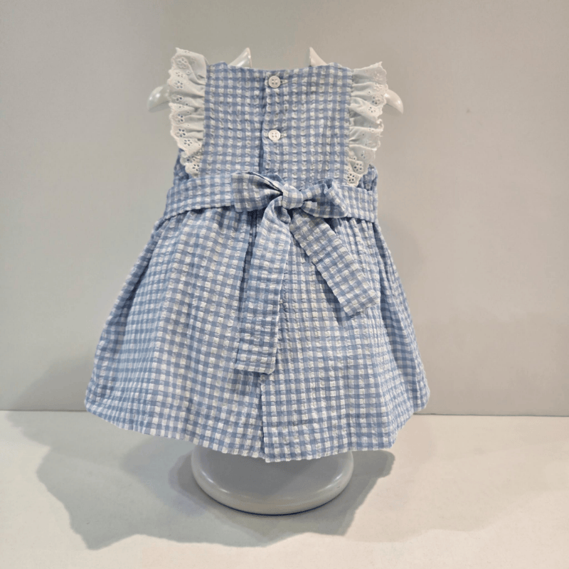 “Vestido Anade de Paz Rodríguez, un susurro de primavera en cuadros celestes. El nido de abeja bordado a mano abraza el pecho con dulzura, mientras las mangas de puntilla blanca acarician los hombros como alas. Ideal para los primeros paseos bajo el sol, acompañado de sus bloomers a juego. Tradición, frescura y poesía en cada puntada.”