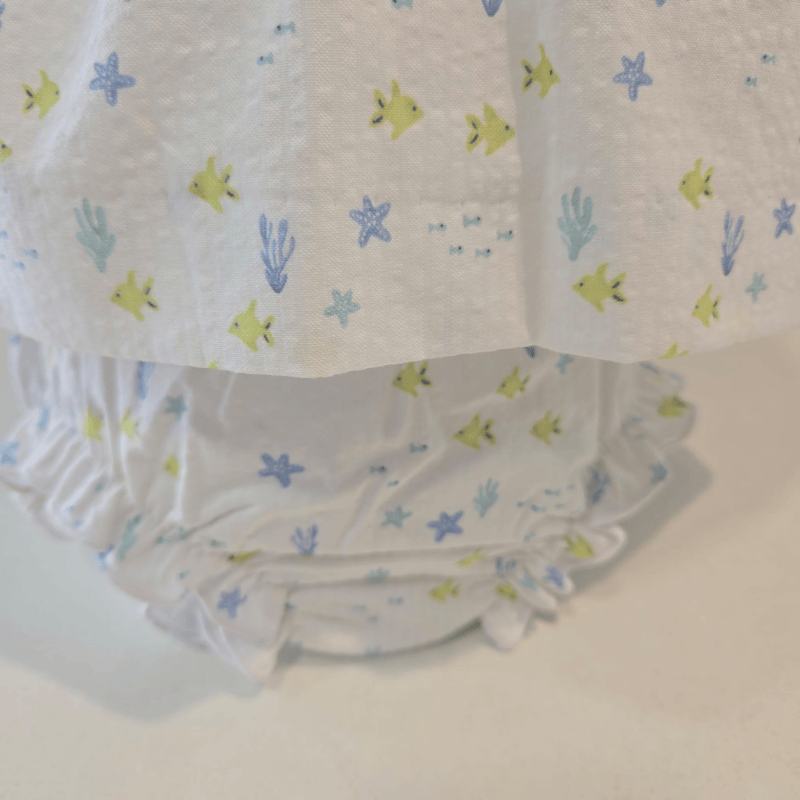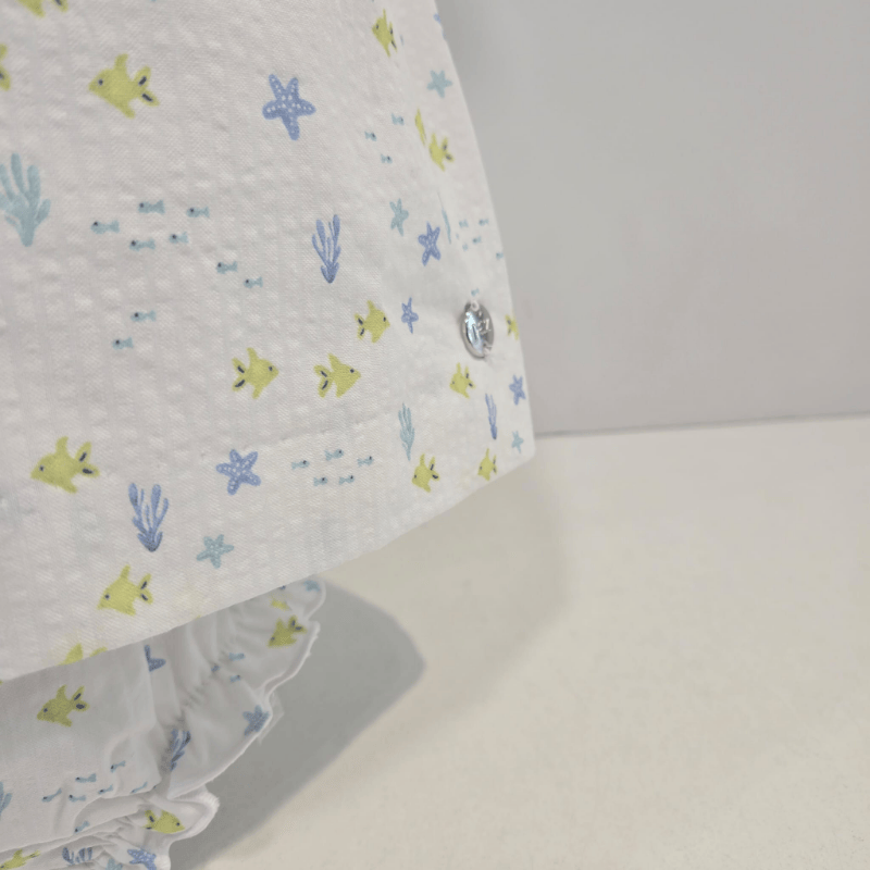 Vestido cuerpo punto falda estampada con braguita Corales verano. Un vestido que parece nacido del fondo del mar: el cuerpo de punto azul cielo, suave y delicado, abraza el torso con dos botones perlados al frente. La falda blanca, ligera y vaporosa, se despliega con un estampado de corales, pececitos y estrellas marinas en tonos azul, amarillo y verde agua. La braguita a juego completa el conjunto con armonía. Ideal para paseos junto al mar, celebraciones estivales o simplemente para vestir con alegría en los días más luminosos. Marca: Paz Rodríguez