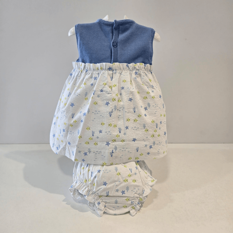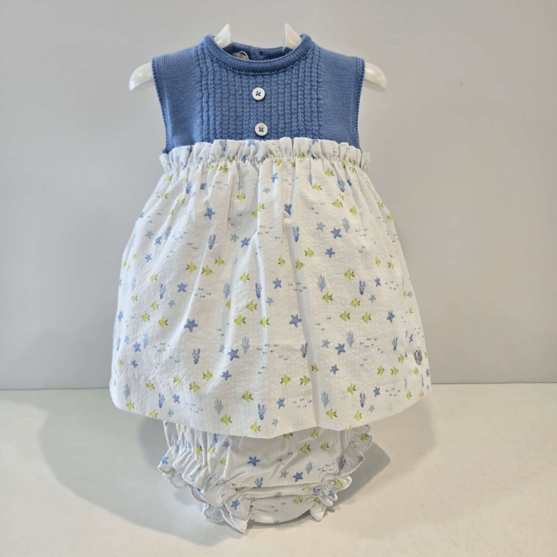 Vestido cuerpo punto falda estampada con braguita Corales verano. Vestido de punto azul con falda estampada marina y braguita a juego. Frescura y encanto para verano de Paz Rodríguez.