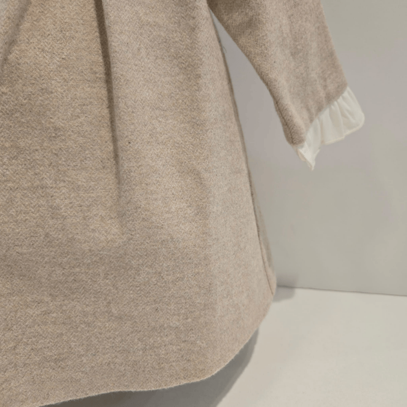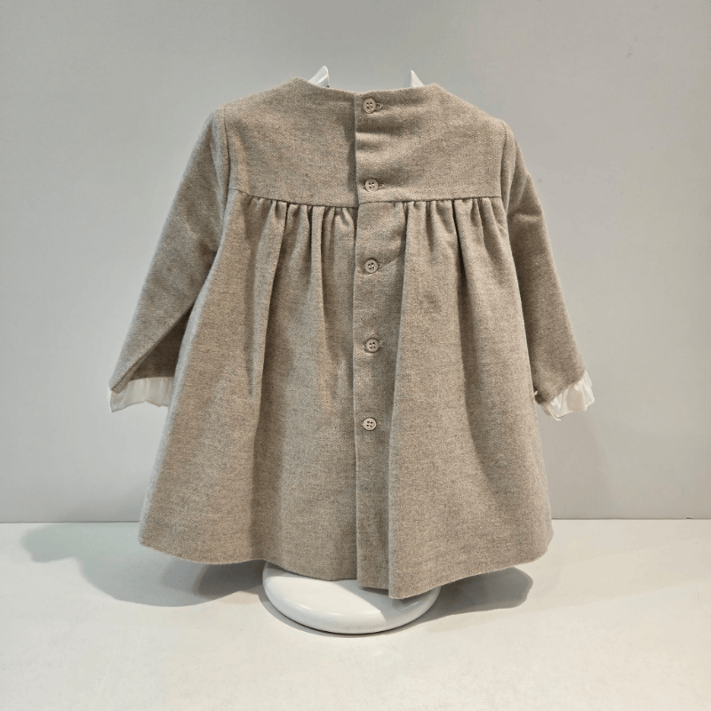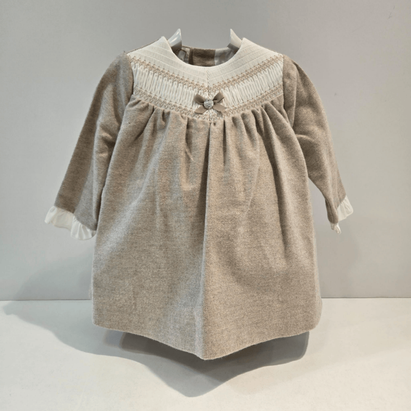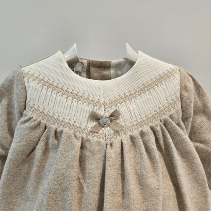 Vestido de espiga color angora con corte clásico y detalles románticos. Yugo punto smock blanco con bordado artesanal, mangas largas con puños fruncidos y lazo decorativo central. Ideal para ocasiones especiales este otoño-invierno.